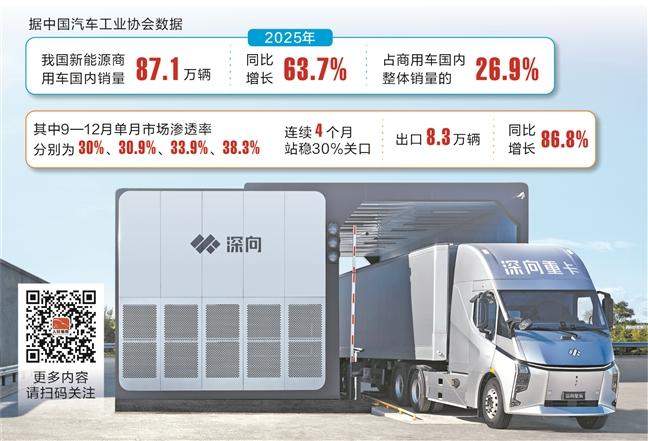 图为深向重卡。 叶玲珍/摄 证券时报记者 叶玲珍 2025年,新能源商用车市场迎来高光时刻,成为汽车赛道中“最靓的仔”。中国汽车工业协会数据显示,2025年我国新能源商用车销量达95.4万辆,同比增长65.5%,远高于汽车行业整体销量增速,国内市场渗透率已连续4个月突破30%。 业内人士认为,30%的市场渗透率标志着新能源商用车已进入规模化应用新阶段,伴随着产品力持续跃升、补能体系加速成型,行业逐步从政策驱动向市场驱动转型换挡。 当电动化行进到一定阶段,新能源商用车的竞争维度也在持续进阶,具备智能化、出海能力以及生态整合能力的车企,有望构建长效发展闭环,在新一轮行业洗牌中脱颖而出。 渗透率持续冲高 “近两年,明显感受到新能源商用车的市场接受度变高了,以前我们需要在营销端费力拓客,现在经常有客户主动上门咨询,甚至直接下单。2025年,门店的业务增量几乎全部由新能源品类贡献,目前新能源车型销售占比已经突破80%。”华东地区一位重卡经销商告诉证券时报记者,相比于燃油版本,电动重卡利润更高,客户黏性也更强。 前述经销商感受到的情况,从新能源商用车销售数据中可以得到印证。据中国汽车工业协会数据,2025年,我国新能源商用车国内销量87.1万辆,同比增长63.7%,占商用车国内整体销量的26.9%,其中9―12月单月市场渗透率分别为30%、30.9%、33.9%、38.3%,连续4个月站稳30%关口;出口8.3万辆,同比增长86.8%。 “2025年新能源商用车销量大增,主要得益于电动卡车市场放量。”杭州鸿途智慧能源技术有限公司副总裁王锋表示,从商用车电动化的历程来看,新能源客车起步较早,目前渗透率已经超过50%,而新能源卡车普及率仍然较低,将成为下一阶段的增长主力,尤其是单车价值较高的新能源重卡。 终端上牌数据显示,2025年我国新能源重卡累计销量达23.11万辆,同比大增182%。其中12月销量为4.53万辆,创单月销量历史新高。 在订单层面,2025年新能源重卡市场迎来千辆级别大单的集中爆发。 2025年12月23日,中国重汽与巴蜀物流签署底盘换电重卡战略合作协议,签约数量达1000辆,首批交付200辆,作为先锋运力在川渝及周边区域投入运营。2025年2月,一汽解放与深圳集装箱运输协会达成全年采购1000辆港口牵引车的战略合作协议;4月又协同时代骐骥,拿下重易时代(江西)新能源科技有限公司1000辆换电重卡订单;5月,DeepWay深向在合肥举办的春季新品上市发布会上,累计斩获2273辆新能源重卡订单。 对于后续市场空间,业内普遍持乐观态度。 “预计2026年中国商用车市场整体销量达425万辆,国内市场增长承压但结构性机会凸显,新能源渗透率将突破35%。”福田汽车副总经理刘旭光在公司2026商务年会上表示。 中国重汽集团总经理刘伟预计,到2030年,新能源重卡渗透率将突破50%,市场规模超45万辆;新能源轻卡渗透率将突破60%,市场规模超46万辆。 向“市场主导”迈进 在多数受访人士看来,新能源商用车渗透率站上30%,不仅印证了政策培育的成效,更意味着行业将逐步告别补贴依赖,迈入市场主导的转型关键期。 “相较于过去紧盯补贴政策的消费逻辑,越来越多的客户开始主动关注产品性能,以及全生命周期综合成本。”前述重卡经销商表示。 从成本端看,伴随着电池价格下降及车电分离模式的普及,新能源商用车售价更为亲民,而在运费不断下降的压力下,新能源车型正成为商用车换购、增购的优选项。 在产品端,三电技术加速演进,新能源商用车综合性能迈上新台阶。 “近年来,动力电池能量密度跃升,助力新能源重卡在不增重、不占货厢空间的前提下,实现续航能力进阶。目前电池容量主要集中在400kWh、500kWh和600kWh三个电量段,分别对应200公里、300公里、400公里的单次续航,可匹配客户大部分运营场景。”DeepWay深向联合创始人兼CMO徐上上告诉证券时报记者,现阶段商用车电池质保普遍在8年4500次循环,市场对电池衰减顾虑也得到了大幅缓解。 在车辆架构方面,越来越多的主机厂从油改电向全新平台过渡,电驱桥技术加速普及。据徐上上介绍, DeepWay深向采用分布式电驱桥与集成电控多挡电驱系统,实现能量转化效率提升14%,全生命周期成本相较油改电卡车降低4.9%。 除产品本身更加精进外,补能网络的快速织密则直击用户痛点,打通新能源商用车规模化落地的“最后一公里”。 “此前,新能源重卡主要应用于港口、矿区、钢厂等倒短场景,在超快充、换电等补能设施跟上后,已经出现了向中长途干线物流领域渗透的趋势。”王锋表示。 在超快充领域,2025年4月,华为发布业界首个全液冷兆瓦级超充解决方案,双枪持续充电电流达2400A,将重卡补能时间缩短至15分钟级别,并联合北奔重汽、北汽福田、DeepWay深向、广汽领程、江淮汽车、东风商用车等商用车头部企业打造超充联盟2.0平台。目前,华为兆瓦级超充解决方案已在深圳、重庆等地密集落地。 换电方面,启源芯动力已建成超1600座充换电站,服务重卡换电超1000万次;宁德时代旗下骐骥换电在2025年度共建成305座换电站,完成“两横两纵”干线布局及14大重点区域组网。按照计划,骐骥换电在2026年将建成换电站900座,干线拓展至“五横五纵”,至2030年将建成总长18万公里、覆盖全国80%干线运力的“八横十纵”全国换电绿网。 福田汽车认为,新能源重卡在300公里以内场景将全面普及,并在300公里―500公里、500公里―700公里