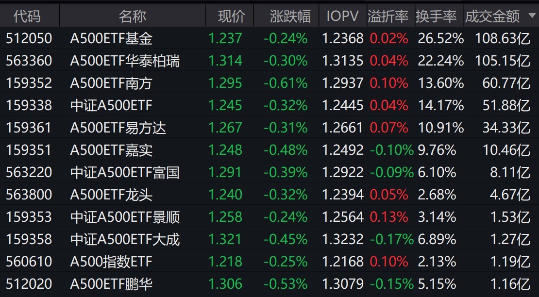 每经记者|叶峰 每经编辑|肖芮冬 市场早盘冲高回落,三大指数集体翻绿,中证A500指数下跌0.39%。从板块来看,商业航天概念持续回暖,油气概念延续强势,煤炭板块快速拉升;下跌方面,贵金属概念冲高回落。 截至上午收盘,场内跟踪中证A500指数的ETF集体下跌。其中,有12只中证A500相关ETF成交额超1亿元,2只超105亿元。A500ETF基金、A500ETF华泰柏瑞早盘成交额分别为108.63亿元、105.15亿元。 有券商表示,进入1月下旬,上市公司年度业绩预告进入密集披露期,市场博弈情绪预计将显著升温,投资主线将从宏观流动性驱动转向微观业绩验证。