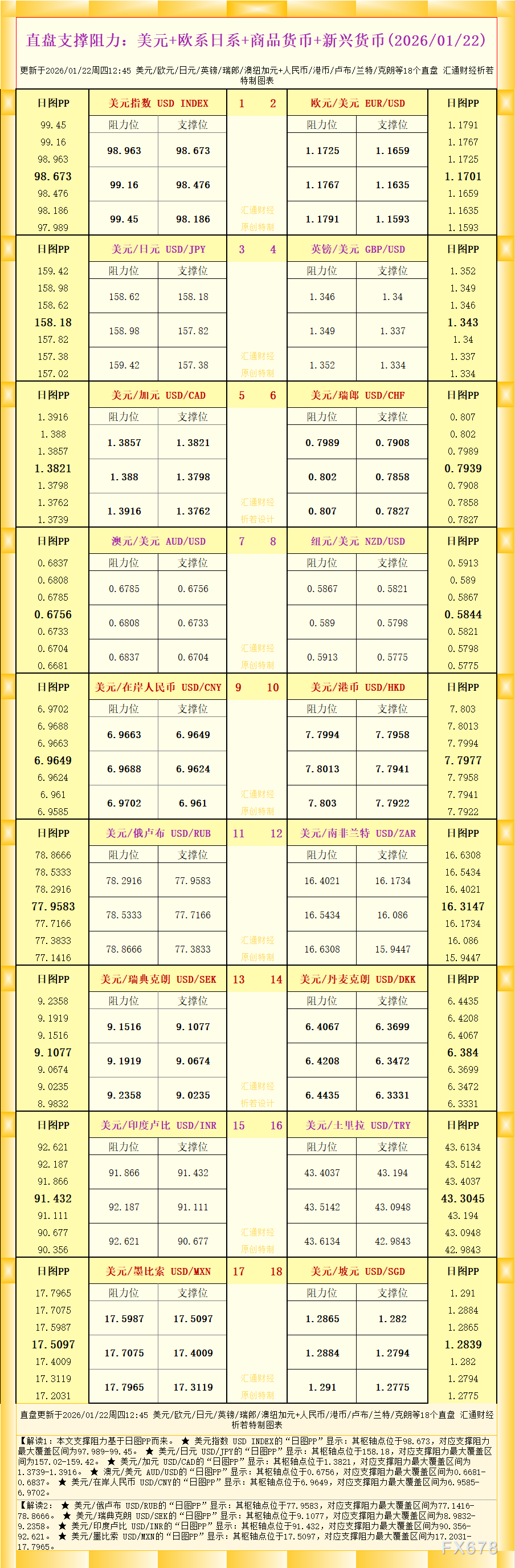 0一张图看直盘支撑阻力:美元+欧系日系+商品货币+新兴货币,更新于2026年1月22日周四12:45,具体美元/欧元/日元/英镑/瑞郎/澳纽加元+人民币/港币/卢布/兰特/克朗等18个直盘,更多详见汇通财经析若特制图表中的内 ...