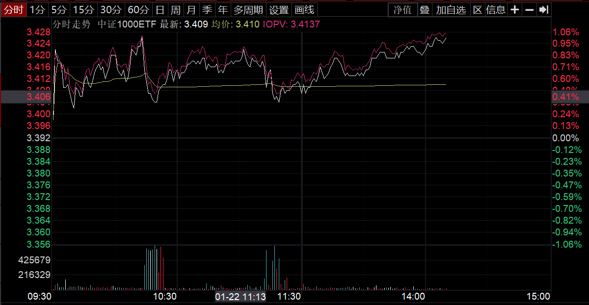 1月22日午后,A股三大指数集体上涨,其中沪指上涨0.16%。截至14:10,中证1000ETF(159845.SZ)上涨1.09%。其他宽基指数中,上证50跌0.35%,沪深300涨0.08%,中证500涨0.46%。