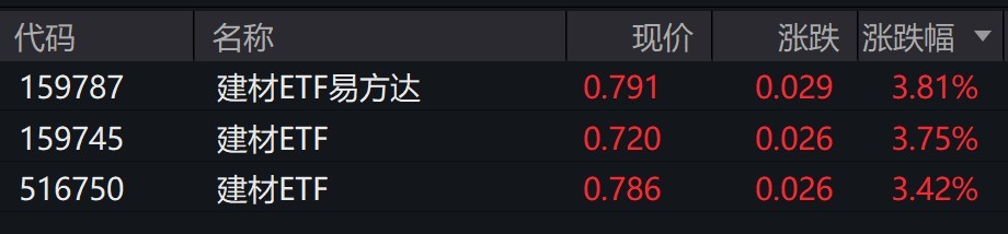 每经记者|叶峰 每经编辑|肖芮冬 建材概念股走强,东方雨虹涨超8%,旗滨集团涨超5%,北新建材涨超4%。 受盘面影响,建材相关ETF涨超3%。