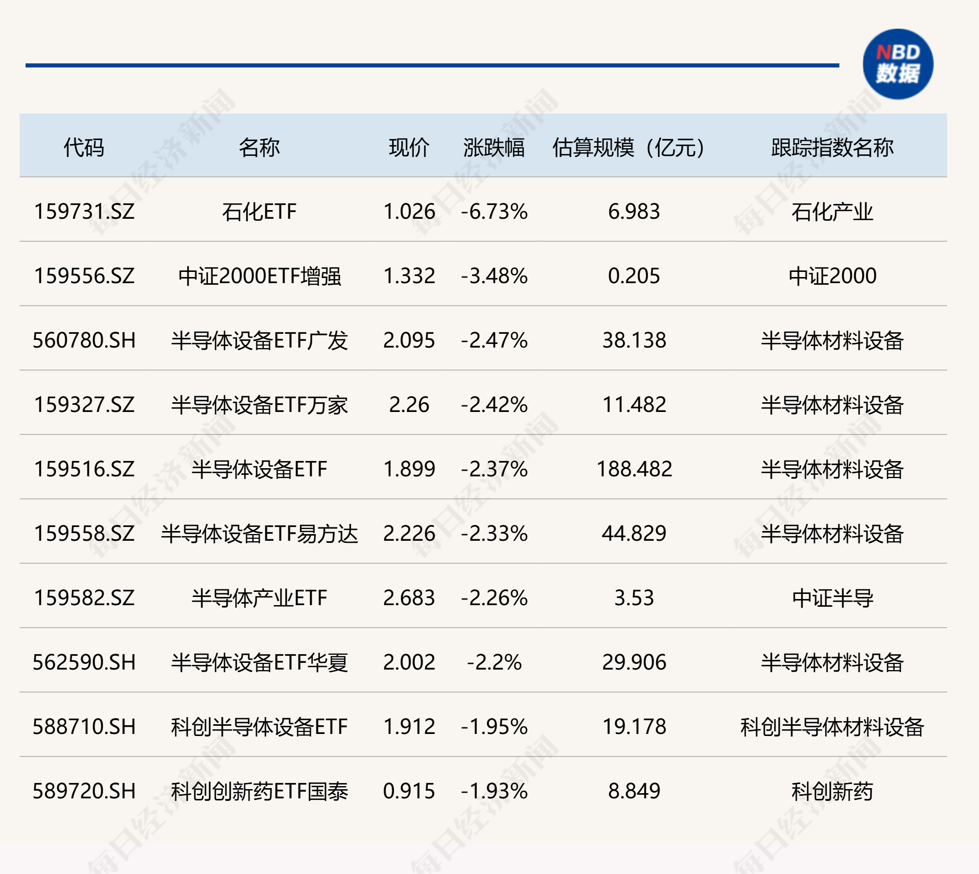 有券商表示,“十五五”时期,商业航天将成为国内推动新质生产力和科技高质量发展的重要引擎。为了抢占宝贵的轨道和频谱资源,2026年我国星座卫星发射数量有望进一步加速增长;民营商业火箭公司有望深入参与,成为国家队的有效补充,共同支撑起高频发射需求。看好2026年我国卫星互联网产业链投资机会。 下跌方面,石化ETF跌超6%,半导体设备相关ETF跌超2%。
