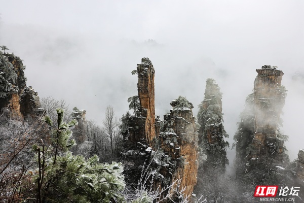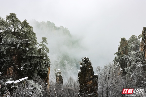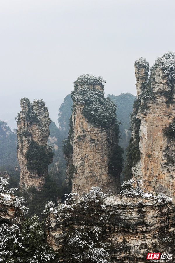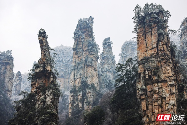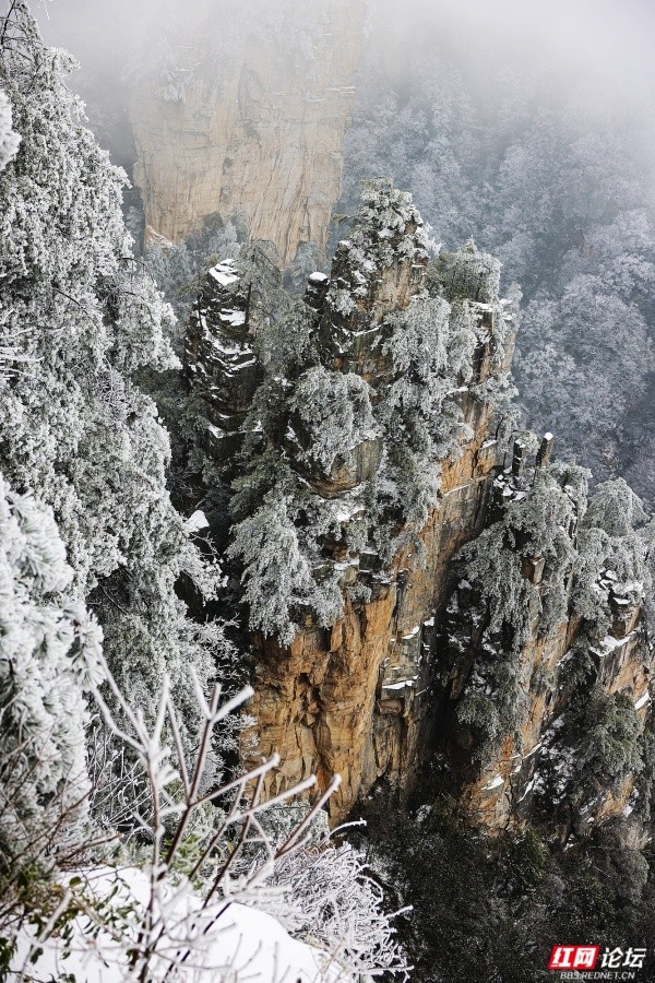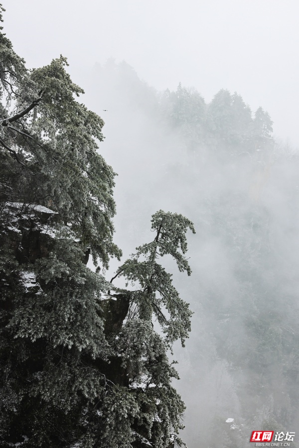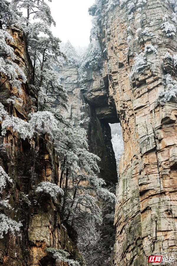 2026年1月20日,湖南省张家界市武陵源天子山、杨家界景区。冬日的冰雪为砂岩峰林与原始森林披上了素净外衣,天子山标志性的砂岩峰林在薄雾中若隐若现,原本陡峭的岩壁与苍劲的松树都覆上了洁白的雪层与雾凇;杨家界的天然石拱门与峡谷间,常绿乔木的枝叶凝结着晶莹霜花,往日里以雄浑险峻著称的峰林此刻多了几分柔和诗意。 雪后的峰林、雾凇与云海交织,让原本以奇特砂岩地貌闻名的景区,呈现出一种刚柔并济的冬日独特美感,冷峻的岩壁与温润的白雪相映成趣,往日的苍翠山林化作一片银装素裹的冰雪世界。