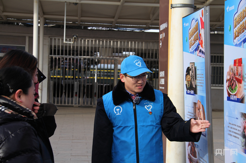 蓟州北站客运员白静为出站旅客介绍蓟州特色美食购买点(央广网发 肖亦杰 摄) 这份用心,在出站口清晰可见。一幅“美食地图”集中展示了桑梓豆片非遗作坊、李氏麻酱蛋直营店等特色商户,不仅提供店铺地址二维码,还配有图文简介。一旁的“大集专线指引牌”,则清晰列明前往西路庄蓟州大集的11路旅游专线时刻,每逢农历一、六集日,这条线路便格外繁忙。 西路庄蓟州大集上,热闹的年味扑面而来,正在采购的孙大娘收获颇丰:“这里的羊排和牛肉都比市里便宜不少。我这次买了二十多斤,过年够用了!这儿气氛多热闹,过两天还得来。”像她一样,许多旅客提着大包小包,满意地踏上归程。 回到蓟州北站,温馨服务仍在延续。安检仪旁的“捆扎服务点”前,客运员正帮赶集回来的旅客魏玉峰把山货纸箱扎得结实。“原来大包小包不好拿,现在站里免费打包,自己用小拖车一拉就走,太省心了!”魏玉峰赞不绝口道。
