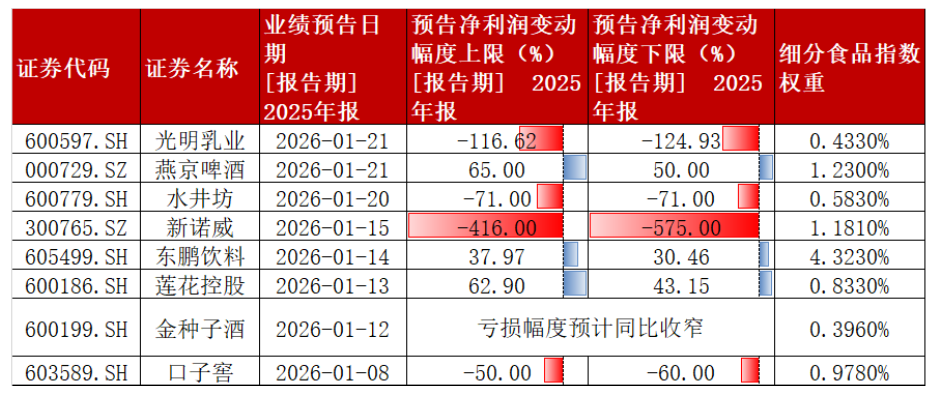 01月下旬进入年报预告密集披露窗口。食品饮料细分板块表现分化,白酒持续亏损,但亏损幅度同比收窄;同时,啤酒、软饮料、调味品板块龙头依然保持正增长,业绩有韧性。 其中,细分食品指数成分股燕京啤酒预计全年净利 ...