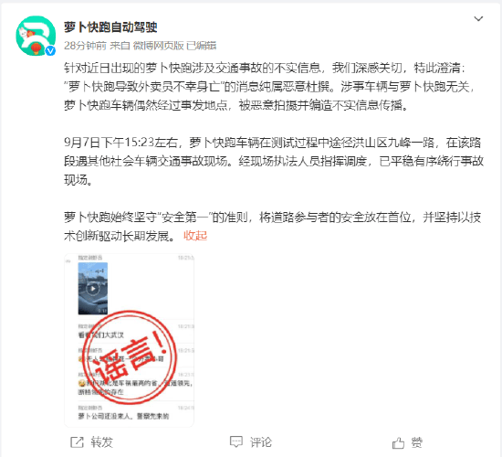 萝卜快跑官方微博发文澄清近期传播的关于萝卜快跑涉及交通事故导致外卖小哥死亡的不实信息,称涉事车辆与萝卜快跑无关,萝卜快跑车辆在测试时只是经过该事发地点,被恶意拍摄并编造不实信息传播。萝卜快跑始终以“安 ...