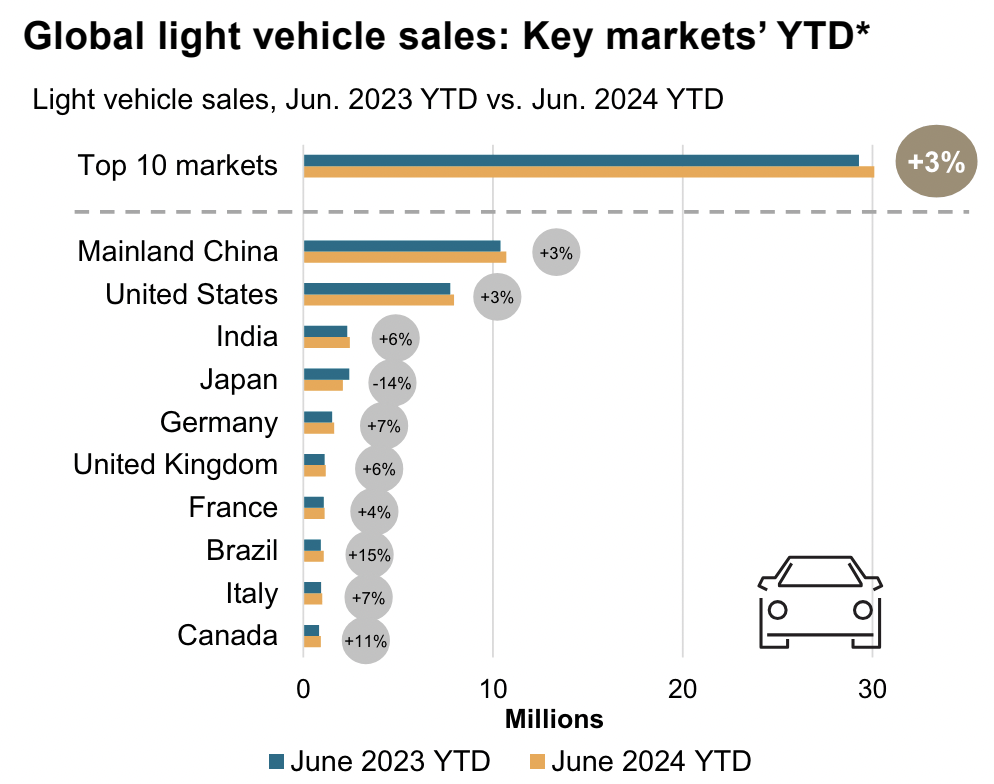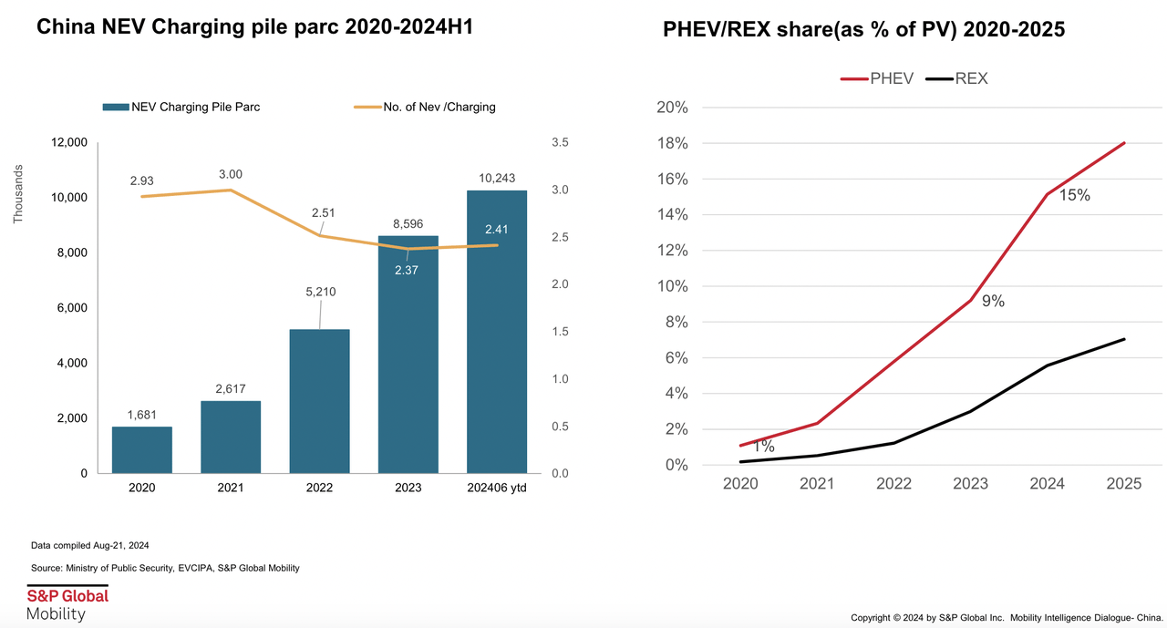 近年来,随着技术的不断进步和消费者对环保意识的增强,智能电动汽车在全球范围内发展迅速,特别是在中国市场,这一趋势尤为明显。 乘联会最新数据显示,今年1~8月,国内新能源乘用车零售累计销量为601.6万辆,同比增长34.9%。其中,8月新能源乘用车零售销量为102.7万辆,同比增长42.6%,渗透率为53.9%,较去年同期37.3%的渗透率提升16.6个百分点。中国汽车工业协会常务副会长兼秘书长付炳锋预测,2024年全年中国新能源汽车销量有望达到1150万辆。 对于国内车市环境,标普全球汽车车辆和动力系统集团副总裁Henner Lehne在2024 Mobility Intelligence Dialogue(北京)分享会上表示,中国新能源汽车产业在全球范围内处于领先地位。他提到,2023年中国新能源汽车(NEV)销量增长了30%,在中国市场占有率达到34%,纯电动汽车(BEV)销量已达500万辆。 BEV库存当前仍处于健康状态 据S&P Global Mobility(标普全球汽车)统计数据显示,2024年上半年全球轻型汽车市场实现了温和增长,全球十大市场的销售额同比增长了3%。具体到各个市场,中国市场的销售增长预计为6%,美国预计有2%的下降,而德国和日本市场预计分别下降14%和8%。 图片来源:S&P Global Mobility 聚焦中国市场,Henner Lehne表示,2023年新能源汽车的国内新车注册销量达到了760万辆,成为全球最大的单一市场。随着中国消费者对新能源产品需求的日益增长,中国品牌正在积极投资新能源汽车技术和产品,推动了市场上新能源汽车产品数量的增加,超过了任何其他海外市场。预计到2024年,新能源汽车(NEV)在中国的乘用车市场的渗透率将达到46%,而纯电动汽车(BEV)的市场占有率预计将进一步提升至16%。 目前市场上主流的新能源汽车,按照分类可以分为纯电动汽车(BEV)、插电式混合动力汽车(PHEV)、增程式混合动力汽车(EREV)和氢燃料电池汽车(FCEV)。S&P Global Mobility(标普全球汽车)报告认为,中国新能源汽车市场近年来呈现出以BEV为主导,同时PHEV市场份额逐年增长的趋势。 销量层面,PHEV销量从2020年的16.81万辆显著增加至2023年的173.14万辆。与此同时,纯电动汽车(BEV)市场的增长速度在2024年则显示出放缓的迹象,增长率预计仅为13%,低于PHEV的64%。 图片来源:S&P Global Mobility 报告称,这种市场动态可能受到多种因素的影响。一方面,充电基础设施的快速扩张,2024年上半年与2023年同期相比增长了54%;另一方面,电池单元价格的显著下降,从2023年1月的每千瓦时1000元人民币降至2024年8月的360元人民币,理论上应有助于降低BEV的成本并刺激市场需求。然而尽管成本下降,BEV的市场增长并未如预期那样加速。 对此,标普全球汽车中国轻型车销售预测经理林怀滨分析认为:“厂家不计成本推动PHEV销量使得BEV价格处于劣势,再加上BEV处于深度去库存阶段,导致BEV增速放缓。但与PHEV高库存相比,BEV的库存目前处于一个比较健康的状态。” 到2030年,全球近30%新车将配备L2+及以上高阶智驾功能 在技术发展方面,自动驾驶技术正成为重塑汽车行业格局的关键因素。 据《每日经济新闻》记者不完全统计,自2017年以来,关于“智能驾驶技术”的相关政策更新已超过一百项标准,广州、深圳、武汉、北京等地也纷纷落地相关政策。S&P Global Mobility(标普全球汽车)预测,到2024年,具备L2+高阶辅助驾驶功能的新车将占轻型车市场的8%,且主要是纯电动车型。 在汽车智能驾驶领域的技术发展上,行业主要聚焦于两种技术路线:一是传统的“感知-决策-规控”模型,依赖于激光雷达、雷达和摄像头等多种传感器;二是端到端大模型技术,正逐渐被蔚来、小鹏、理想等越来越多车企采用。 在极越CEO夏一平看来,端到端纯视觉技术是当前的最佳选择,预计未来将有更多品牌加入。尽管如此,也有观点认为纯视觉技术在某些驾驶环境中的安全性可能不及激光雷达。对此,速腾聚创全球智驾行业总经理徐钰滨表示:“在过去十年里,无论在自动驾驶市场,还是在机器人市场,激光雷达都是非常关键且成熟的传感器。” 图片来源:每经记者 董天意 摄(资料图) 标普全球汽车的高级分析师陆道宽认为,端到端自动驾驶技术的应用需要大规模的软件投入和算力支持。在激光雷达这一自动驾驶关键传感器领域,随着ADAS和Robotaxi在中国市场的快速发展,中国企业预计将在未来十年内保持全球领先地位。 标普全球汽车数据显示,中国企业激光雷达销量占全球销量比例已超过80%。2024年,中国激光雷达企业市场销量占比预计将超过90%,速腾聚创、禾赛科技和华为三家头部企业目前合计占据全球激光雷达销售额的60%以上。 展望未来,陆道宽预测L2+自动驾驶技术的渗透率将持续增长,不仅覆盖纯电动车型,也将扩展到混动和燃油车型。随着成本的降低和政策的支持,更多经济实惠的车型将配备这些高级辅助驾驶功能,尤其在纯视觉方案的推动下。预计到2030年,全球近30%的新车将配备L2+及以上的高阶智驾功能。 利润率挑战与政策变动成行业难题 乘联会数据显示,2024年上半年全球汽车总销量为4390万辆,其中新能源汽车销量为739万辆,占比约16.8%,同比增长21%。然而随着全球汽车行业向电动化转型,汽车制造商正面临一系列新的挑战。 S&P Global Mobility(标普全球汽车)认为,制造商目前的主要难题包括利润率难以提升和政府支持减少等。例如,欧盟计划在2025年7月实施更严格的欧7排放标准,这可能会促使消费者和企业在年底前提前购买或销售高二氧化碳排
