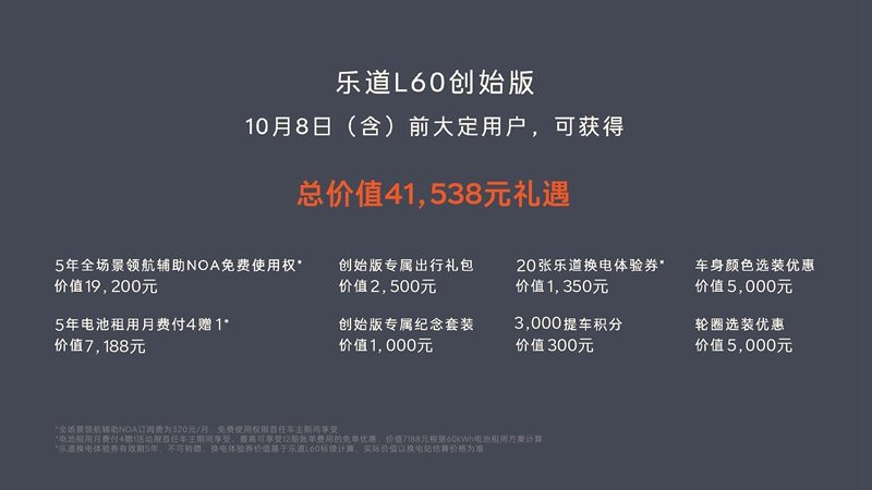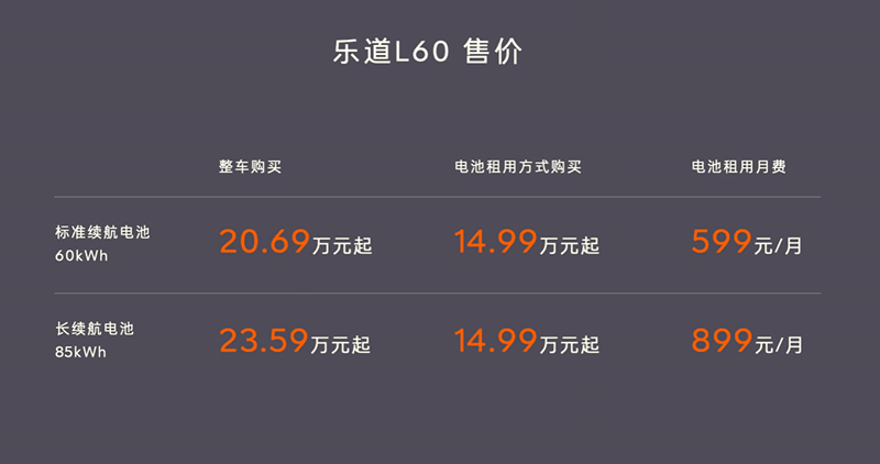 日前,蔚来第二品牌乐道首款车型乐道L60正式上市,新车共推出两款车型,售价分别为20.69万、23.59万元,起售价比特斯拉Model Y便宜4.3万元,新车即刻开启预订,将于9月28日开启全国交付。 如果采用电池租用方式购买,裸车价格仅14.99万元;标准60kWh版,电池月租费用599元/月;长续航85kWh版,电池月租费用899元/月。鉴于乐道和蔚来一样也支持换电,因此采用BAAS电池租用的方式买车或是最佳选项,尤其是对预算有限的年轻购车群体。尽管乐道L60目前可用换电站仅304座,但官方表示今年年底乐道可用换电站将达到 1000+座。 此外,10月8日前大定的用户,均为乐道L60创始版,可享受包含5年全场景NOA免费使用权、20张换电体验券、5年电池租用付4赠1等权益。 乐道L60长宽高为4848*1930*1616mm,轴距2950mm,定位纯电中型SUV。尽管乐道L60造型是与Model Y一样的溜背SUV,但得益于长轴短悬设计、溜背位置又更靠后,L60可实现车内二排跷二郎腿和头部自由。 内饰方面,乐道L60提供了13英寸HUD+17.3英寸3K分辨率超大中控横屏+8英寸后排娱乐控制屏,车机采用了目前性能最强的8295P高性能满血版座舱芯片,标配同级最大的24GB车规级,以及256GB的车规级高速储存,配合Coconut椰子智能系统,智能座舱体验领先同行。 动力上,乐道L60提供后驱、四驱两个版本,后驱版功率240kW,电机大小比Model Y小50%。四驱车型总功率340kW,零百加速4.6秒。值得一提的是,乐道官方宣称的L60电耗水平为12.1kWh/100km ,比Model Y的 12.5更优。乐道汽车用户与服务运营负责人庆华驾驶乐道L60从安徽合肥出发进行环中国自驾游的超长直播。车上装载5个行李箱,坐3-4人,最终,他全程行驶了36天,走过84座城市,行驶了20352km,行驶海拔最高5231km沿途换电19次。实测的平均电耗只有12.3度电/100km,全程能耗远超同级车型。 乐道L60全系标配视觉智驾方案,搭载30个高性能感知硬件,包含1颗4D成像毫米波雷达、7颗800万像素高清摄像头,4颗星光360度摄像头。同时,乐道L60智驾系统交付即可用,全场景NOA领航辅助,覆盖全国726个城市;智能泊车系统泊入成功率超过98%,平均泊车耗时小于40秒。 在车辆安全方面,乐道L60采用钢铝混合双舱车身,整车7处关键部位采用2000MPa潜艇级钢材;全系标配45项主动智能安全配置,夜间AEB最高刹停时速高达120km/h。 乐道L60提供标准续航555公里、长续航730公里和超长续航1000公里(正在规划中,后续推出)三种不同续航版本,支持蔚来换电,三分钟可完成补能。同时,比Model Y更大、更便宜、更省电,乐道L60卖爆几无悬念。 (责任编辑:董萍萍 )