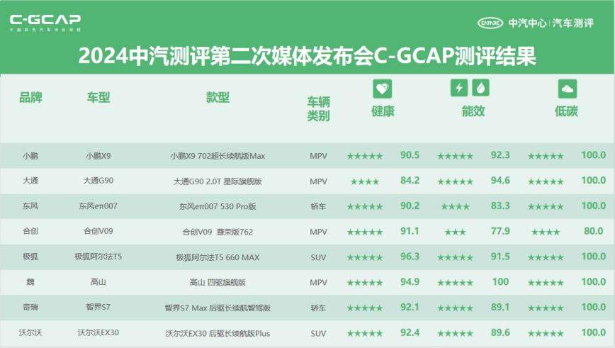 9月19日,中汽中心汽车测评管理中心(以下简称“中汽测评”)在天津举行2024第二次媒体发布会,汇聚了来自汽车企业和权威媒体的120余位代表。此次发布会不仅揭晓了中国智能网联汽车技术规程C-ICAP、中国绿色汽车评价规程C-GCAP的最新测评结果,还正式发布了中国首个商用车专业测评品牌,以及首期《CCRT选车指南》中型及中大型新能源轿车推荐名单。 C-ICAP测评结果,车辆智能指标一目了然 为实现对智能网联汽车的全面评价,C-ICAP技术规程覆盖辅助驾驶、自动驾驶、智慧座舱和信息安全等方面。C-ICAP(1.1版)主要对辅助驾驶单元、智慧座舱单元进行评价。在辅助驾驶单元,行车辅助项目包括基础行车辅助(必测项)和领航行车辅助(增测项),泊车辅助项目包括基础泊车辅助(必测项)和记忆泊车辅助(增测项)。辅助驾驶单元的初始星级由必测项得分率决定,对于必测项达到4星级的车型,如果增测项测试得分率超过85%,最终星级可增加“☆”。在智慧座舱单元,主要围绕汽车座舱智能交互、智能护航、智慧服务三个维度展开专业测评。 本次共发布6款车型测评结果,分别是大通G90、小鹏X9、深蓝SL03、腾势N7、问界M9和智界S7。按照C-ICAP(1.1版)进行测试评价:小鹏X9、深蓝SL03、腾势N7、问界M9、智界S7行车辅助获得“5星+”,深蓝SL03、问界M9、智界S7泊车辅助获得“5星+”,腾势N7、问界M9、智界S7智慧座舱获得“5星”。 至此,C-ICAP(1.1版)已累计发布12款车型测评结果。C-ICAP(1.1版)的实施,对于智能网联汽车产业发展起到了重要推动作用,一方面为相关政策、标准落地提供先试先行经验,服务政府行业管理,另一方面引导企业智能网联技术发展,推动产品性能提升。与此同时,全面、丰富的测评结果也为消费者选车用车提供专业参考,促进用户形成理性认知,引领科技消费。 C-GCAP测评结果,车辆绿色性能全景扫描 本次共发布8款车型测评结果,分别是大通G90、小鹏X9、eπ007、极狐阿尔法T5、沃尔沃EX30、合创V09、魏牌高山和智界S7。按照C-GCAP(试行版)对车辆健康、能效和低碳三个版块的绿色性能进行测试评价,并分别进行星级评定。 测评结果显示,小鹏X9、eπ007、极狐阿尔法T5、沃尔沃EX30、合创V09、魏牌高山、智界S7健康版块获得五星评价,大通G90、小鹏X9、极狐阿尔法T5、沃尔沃EX30、魏牌高山、智界S7能效版块获得五星评价,大通G90、小鹏X9、eπ007、极狐阿尔法T5、沃尔沃EX30、魏牌高山、智界S7低碳版块获得五星评价。 至此,C-GCAP(试行版)已累计发布21款车型测试结果。随着C-GCAP(试行版)的实施,行业对于汽车的绿色性能更为关注,各车企积极响应C-GCAP测评,不断优化产品设计,提升相关性能,C-GCAP测评结果也为消费者关注并选择绿色汽车产品提供有效参考。 在本次发布会上,中汽测评还发布了《2024中国汽车辅助驾驶现状洞察》,以“汽车测评国家队”的权威视角,系统性地归纳了中国汽车辅助驾驶技术的应用现状,对各项关键发展指标进行了深入的解读与前瞻性分析。 中国首个商用车专业测评品牌发布 本次发布会的另一项重要内容,是现场发布了中国首个商用车专业测评品牌――“中国商用车专项评价”。面对商用车保有量不断增加的国情现状,商用车市场由高速发展期逐步转变为转型升级期,用户对商用车产品的诉求不仅仅局限于 “多拉快跑”,更多地考虑车辆的安全、经济、体验等。 “中国商用车专项评价”的发布,进一步丰富了测评板块,为“汽车测评国家队”形象注入了新内涵,不仅标志着中国商用车行业在测评标准上迈出了坚实的一步,更将深刻影响并引导消费者的购车决策,促使市场向更加注重品质、安全、智能与绿色的方向健康发展。 9款车上榜,首期《CCRT选车指南》推荐名单出炉 继在上半年第一次媒体发布会对CCRT进行品牌焕新升级后,中汽测评再有新动作,发布首期《CCRT选车指南》推荐名单。中型及中大型新能源轿车市场作为新CCRT实施后调研的首个细分市场,中汽测评结合市场内车型销量及热度综合选取26款车型,经过消费洞察和用户调研,最终确定9款推荐车型纳入首期官方消费指引产品《CCRT选车指南》中。 在此环节中,中汽测评还宣布对CCRT的LOGO形象进行焕新升级:在传承与沉淀CCRT品牌的同时,将原有的绿色,升级为咖色,视觉效果更聚焦,提升了品牌辨识度;CCRT英文字母下增加“选车指南”,并采用“对号”符号作为点睛之笔,极具视觉冲击力。《CCRT选车指南》将持续专业洞察汽车消费和用户体验,为消费者指明选车购车方向。 随着2024版C-NCAP、C-ICAP、C-GCAP的正式实施,汽车安全、绿色、智能测评都迈上了新台阶。同时CCRT转型升级,更加贴近消费者。中汽测评将积极发挥“汽车测评国家队”的使命担当,持续推动汽车行业向大安全、智能化、绿色化的深刻变革迈进,同时,也持续关注中国道路交通特点、痛点,以及消费者的选车用车需求,通过独立、公正、专业、开放的测试评价,为消费者当好选车购车参谋,促进汽车质量提升和新技术应用。 【免责声明】此文内容为本网站转载其它媒体或转载企业宣传资讯,仅代表作者个人观点,与本网无关。仅供读者参考,并请自行核实相关内容。 (责任编辑:张晓波 )