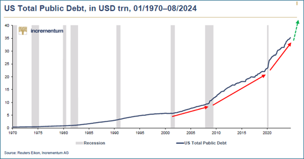 黄金周一冲上2630美元历史新高,受到美联储降息50个基点的提振外,另一个关键原因是美国赤字和债务创下新的世界纪录,债务总额达到35万亿美元。