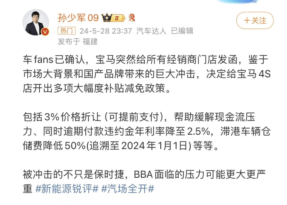 蓝鲸新闻9月23日讯(记者 陆鹏鹏)8月销量暴跌,退出价格战仅仅一个多月后,宝马又降价了。 宝马又降价? i3低至19万,i7降价50万 销售:指标还没完成,月底冲销量 今日,宝马重返价格战的话题冲上热搜,消息称,宝马旗下多款热销车型价格下调。对此,蓝鲸新闻记者致电多家宝马4S店咨询情况。 销售称:“现在订车优惠确实比上个月大,但优惠幅度不及6月份那会。以i3为例,裸车价格可以到19万左右,具体价格还能再谈。如果要想降到6月份的价格那是不太可能的,因为后面没车了。下个月i3和3系要出新款,等到上新时价格不会这么低了。” 记者了解到,除了i3外,3系、5系、7系等也有不同程度优惠。但相比之下,纯电车型的优惠力度更大。 以i7为例,在汽车资讯平台上,该款车型原价 145.90 万元,国内多地4S店的降价幅度达到38%,最高下调超50万。 对此销售解释称:“i7车源不多,大部分库存时间较长,因此折扣力度较大。” 当谈到宝马重返价格战的话题时销售称:“网上的消息看看就行,这段时间宝马一直挂在热搜上就没下来过。近期降价是因为我们月底指标压力大,所以优惠幅度较大,价格会下来一些。现在指标还没完成,价格差不多能做就做了。另一个原因是,i3、3系等车型目前正在扫尾清库存,等到10月新款车型出来后,价格不会这么低了。” 宝马重返“价格战”背后: 8月售出3.4万辆新车,中国仍是最大市场 近年来,在国内造车新势力的围剿下,传统一线豪华汽车品牌BBA逐渐式微,宝马、奔驰在华均呈现不同程度下滑。 据懂车帝最新数据显示,8月份,宝马售出34846辆新车,较上月少卖了14092辆。 对比之下,宝马的老对手奔驰奥迪在华销量要好上许多,数据显示,奔驰8月销量为49560辆,基本与上月持平。奥迪8月销量为47900辆,较上月多卖出2667辆。 业绩方面,财报显示,2024上半年宝马集团汽车业务总收入630.09亿欧元(约合人民币4916.21亿元),与去年同期基本持平。 总销量方面,2024年上半年宝马集团在全球市场共交付121.3万辆新车(含宝马、MINI、劳斯莱斯),同比下滑0.1%。 其中,中国市场为宝马集团销量下滑最多的市场,共计交付37.64万辆,同比下滑4.3%。值得一提的是,虽然销量下滑,但中国仍是宝马集团全球最大单一市场,占宝马集团全球总销量31%。 对于在中国市场销量下滑的原因,宝马集团表示,宝马及其同行在关键市场中国面临压力,中国本土汽车制造商正凭借成本较低的电动汽车赢得市场份额,迫使其欧洲竞争对手大幅降价。 经销商单方面策略 在降价与涨价间反复横跳 在销量下滑的背景下,上半年开始宝马被迫卷入价格战。 今年5月底,有汽车博主发文称,宝马给所有经销商门店发函称,鉴于市场大背景和国产品牌带来的巨大冲击,决定给宝马4S店开出多项大幅度补贴减免政策,意在帮助经销商应对短期困难,缓解业务压力。 政策出台后,宝马的多款车型价格大幅跳水,其中以i3、ix3等纯电系列为主,曾经的豪华品牌,如今用不到20万的价格便可购入,宝马的价格战一定程度上刺激了销量的提升。 然而好景不长,从6月底开始,宝马逐渐退出价格战。宝马中国官方给出的回应是,下半年宝马在中国市场将重点关注业务质量,支持经销商稳扎稳打。受此影响,宝马经销商们纷纷减少终端价格促销力度,上调单车售价。 今年成都车展期间,宝马集团大中华区总裁兼CEO高翔称,“目前的价格战,无论对于汽车厂家、消费者还是经销商来说都是不健康的,也是不可持续的。” 宝马官方近期没有对建议零售价做任何调整,采取的主要措施是在今年下半年给予经销商更大的灵活性。他们根据市场情况自主决定销售时的终端零售价格,厂家无权干预。 不可否认的是,价格战确实给经销商带来了不小的经营压力,4S店几乎陷入了卖一台亏一台的恶性循环,不仅如此,降价销售还伤害品牌价值,曾经代表豪华的宝马,如今已逐渐式微。 到了9月底,销量大跌后多家宝马4S店再度下调多款车型价格,综合多方门店的回应来看,这一调整并非宝马官方的决定,而是4S店单方面的降价促销策略。 从卷入价格战到退出价格战,再到重返价格战,宝马在降价与涨价之间反复横跳,销量的下滑让经销商们在定价策略上略显焦躁。归根究底,销量的多少在于产品本身,消费者最终会用脚投票。 本文首发于微信公众号:蓝鲸新闻。文章内容属作者个人观点,不代表西瓜财经立场。投资者据此操作,风险请自担。 (责任编辑:宋政 HN002)