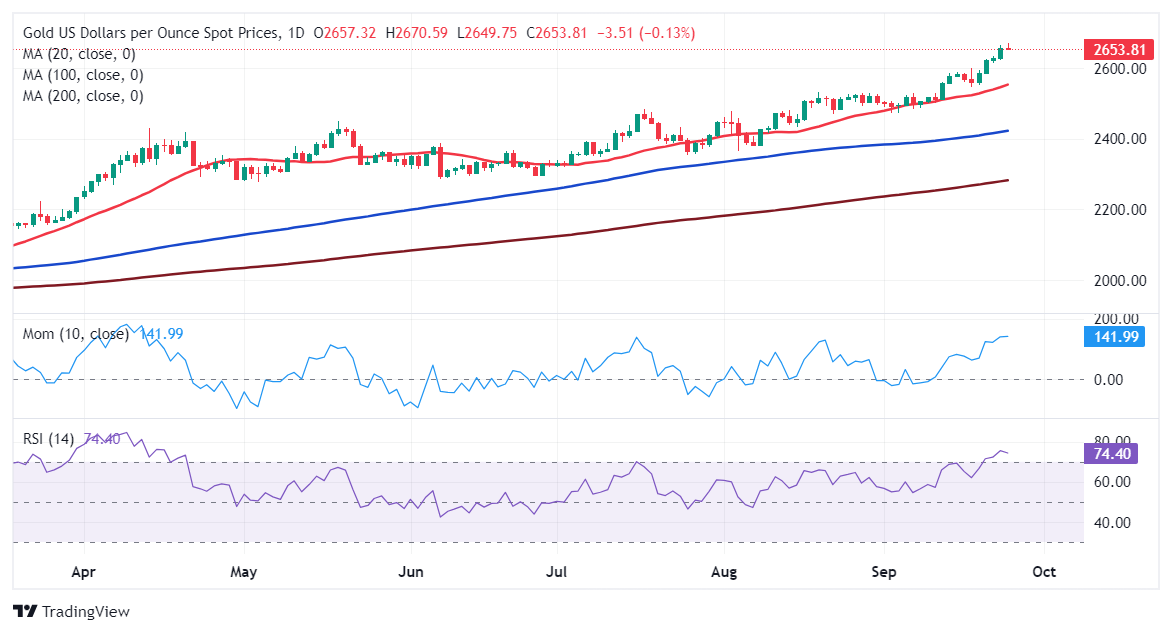 周四(9月26日)亚市盘中,现货黄金基本持稳,目前金价交投在2660美元/盎司附近。本交易日,黄金交易员将聚焦美联储主席鲍威尔讲话,预计将引发金价大行情。FXStreet首席分析师Valeria Bednarik撰文,对黄金技术前景进行分析。 Bednarik写道,黄金价格已经从纪录新高回落,但看跌潜力仍然有限。 现货黄金周三盘中最高触及2670.53美元/盎司,但受美元和美债收益率走强打压,金价自高位大幅回落,最终收报2656.55美元/盎司。 交易员等待美联储主席鲍威尔的演讲和美国通胀数据,以进一步探询利率政策走向。 北京时间周四21:20,美联储主席鲍威尔预先录制视频为纽约联储2024年国债市场会议致开幕词。 ![]() 当地时间上周三,美联储宣布降息50个基点。美联储主席鲍威尔在新闻发布会上表示,不要以为降息50个基点“是新的降息节奏”。 鲍威尔在新闻发布会上表示:“我们一直等待着,我认为这种耐心确实带来了回报,我们相信通货膨胀将持续迈向低于2%,所以我认为这就是我们今天采取这一强有力举措的原因。我认为任何人都不应该看到这一点,然后说,‘哦,这是新的节奏。’我认为,我们将谨慎地一次又一次地开会,并在开会时做出决定。” 鲍威尔称:“我们正在重新调整我们的政策立场;我们的(经济)预测中没有任何迹象表明我们急于采取行动;美联储的经济预测是基线预测;我们实际采取的行动将取决于经济的发展情况;如果合适的话,我们可以加快或放慢降息的步伐,甚至选择暂停降息;这次降息50个基点并不表明我们急于采取行动。” Blue Line Futures首席市场策略师Phillip Streible表示,假如劳动力持续疲软,且美联储主席鲍威尔重申降息50个基点,那么未来一两天可能会看到黄金2700美元/盎司的水平。 交易员认为,美联储11月降息50个基点的可能性为60%。由于黄金不生息,因此利率下降会增强黄金的投资吸引力。 除了鲍威尔之外,周四还有多位美联储重量级官员讲话。 北京时间周四21:15,美联储理事鲍曼将就经济前景和货币政策发表讲话;北京时间周四21:25,纽约联储主席威廉姆斯将发表讲话;北京时间周四22:30,美联储理事巴尔将发表讲话。