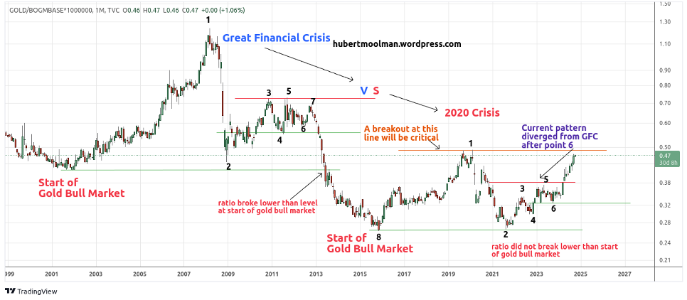 黄金资讯网站Gold-Eagle分析师Hubert Moolman表示,市场信心正转向黄金,而不是美元。2008年金融危机期间,货币体系面临巨大挑战,为遏制金融危机,各国通过增加货币基础创造了大量美元。但他表示,现在与2008年不同,这将是法定货币的终结。 Hubert提到,市场能够避免法定货币的崩溃,但潜在的问题是接受极度贬值的货币。他强调:“显然(危机)并没有消失,因为解决方案进一步贬值了货币。” “由于货币供应速度急剧下降(债务过高,无法支撑系统中的货币水平),系统普遍缺乏流动性,”他续称。货币基础的增加最终解决了流动性问题,但代价是货币贬值到前所未有的水平。 到2020年3月,货币体系再次面临危机。同样,大量美元被创造出来以应对这一问题。 再次,货币供应速度急剧下降,而再次,货币基础的大幅增加是补救措施。 他提出质疑:“金融体系仍在坚挺,但能撑多久?增加美元供给的补救措施是否能产生与全球金融危机期间相同的效果,还是发生了其他事情?” 他分享了美元、黄金价格相对于美国货币基础的图表: ![]() (来源:GoldSeek) 该图表显示了黄金价格与圣路易斯调整后的货币基础的比率,即以美元计价的黄金价格除以圣路易斯调整后的货币基础(以十亿美元计)。 该比率可以解释为衡量货币贬值的程度,图表上的点8是美联储成立以来的最低点,因此也是货币贬值最严重的一次。 当该比率上升时,信心会转向黄金而不是美元。在20世纪70年代末至80年代初,该比率在抛物线式上涨期间高达5。需要大幅提高利率才能使信心回归美元(货币体系)。 Hubert指出,这一比率的抛物线式上升也可以解释为美国金融体系的银行挤兑。 在全球金融危机期间,当货币基础增加时,图表的比率大幅下降至点2。这几乎回到了2001年黄金牛市开始时的水平。直到2008年12月,金价才上涨到足以使该比率再次走高。 在2020年危机期间,当货币基础增加时,该比率也大幅下降至点2。同样,这几乎是2015年黄金牛市开始时的水平。 在比率缓慢上升的过程中,从点2到点6,两种模式保持了相似的形态。然而,在点6之后,出现了显著的偏差。 金融危机期间,该比率在点7就失效了,无法超过点3和点5,最终创下历史新低。美元贬值到极点,但人们对该体系的信心仍然保持。换句话说,金价仍然受到抑制。 2020年的危机走上了一条不同的道路,与2024年全球金融危机期间的模式不同,当时黄金在3月份实现了重大突破。黄金价格没有受到遏制,人们对美元货币体系的信心和信心正在迅速崩盘。 Hubert强调,突破金色线将是这一趋势,即信心从美元转向黄金的重要确认。在某种程度上,这感觉就像各级银行挤兑一样。 |