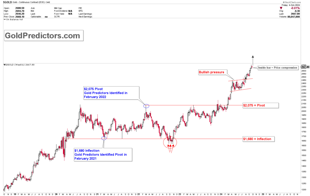 随着金价飙升,技术指标显示,金价可能正处于持续上涨、迈向历史新高的边缘。根据Gold Predictors 10月5日发布的分析报告,这一前景的一个关键特征是出现了“内包线形态”,这意味着价格受到挤压,这种现象通常表明 ...