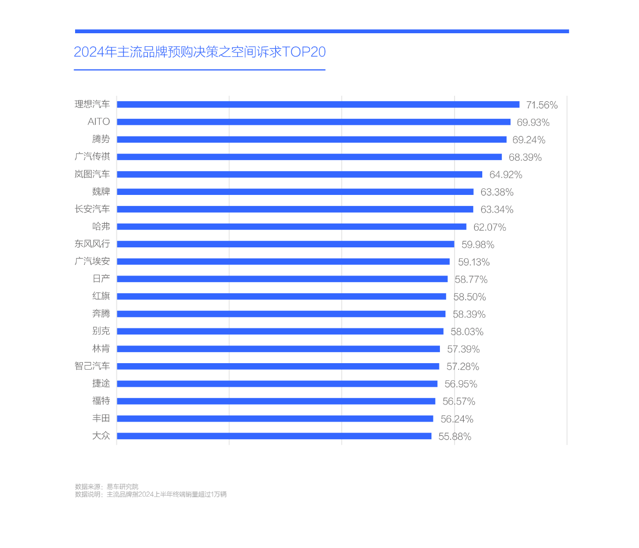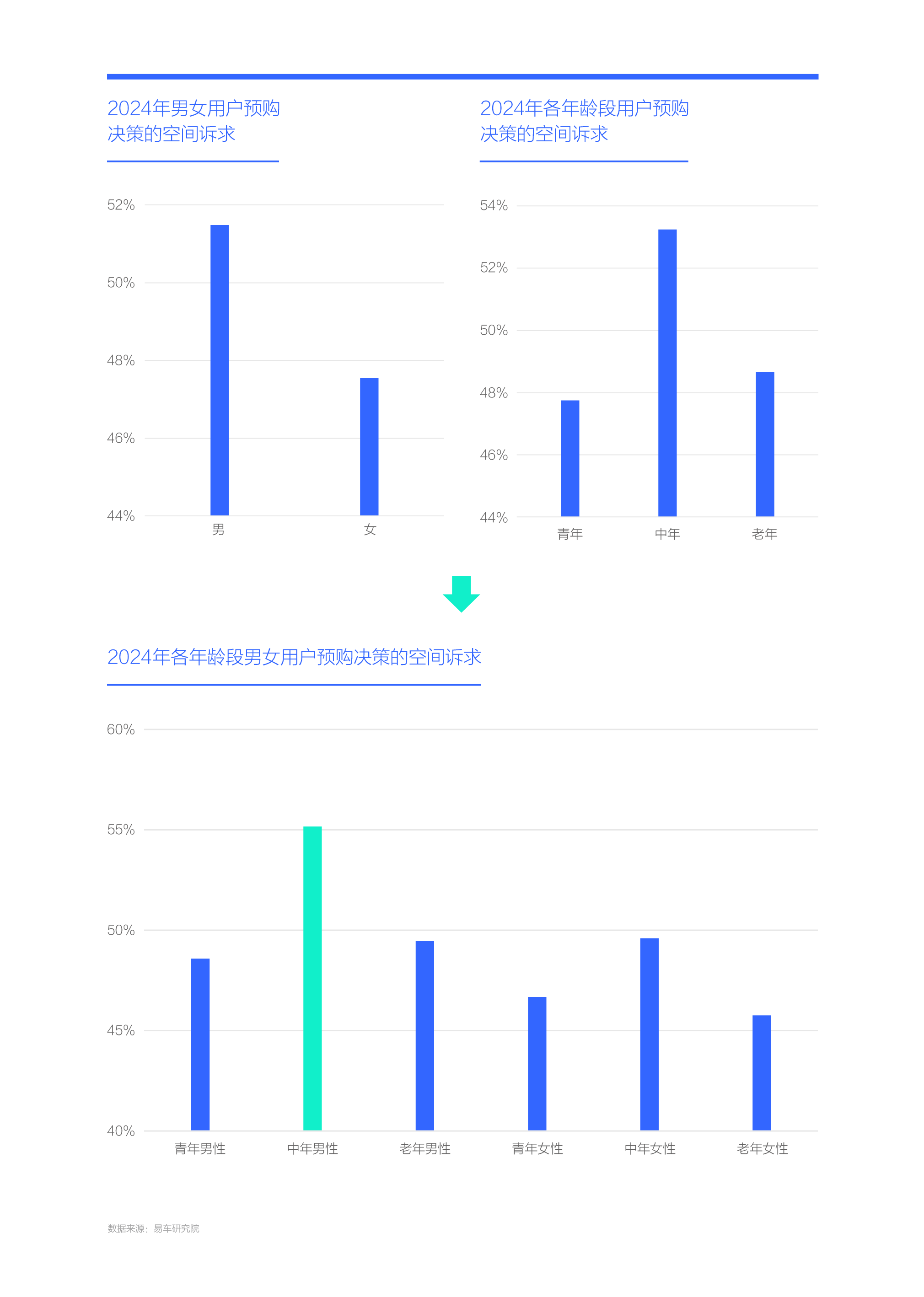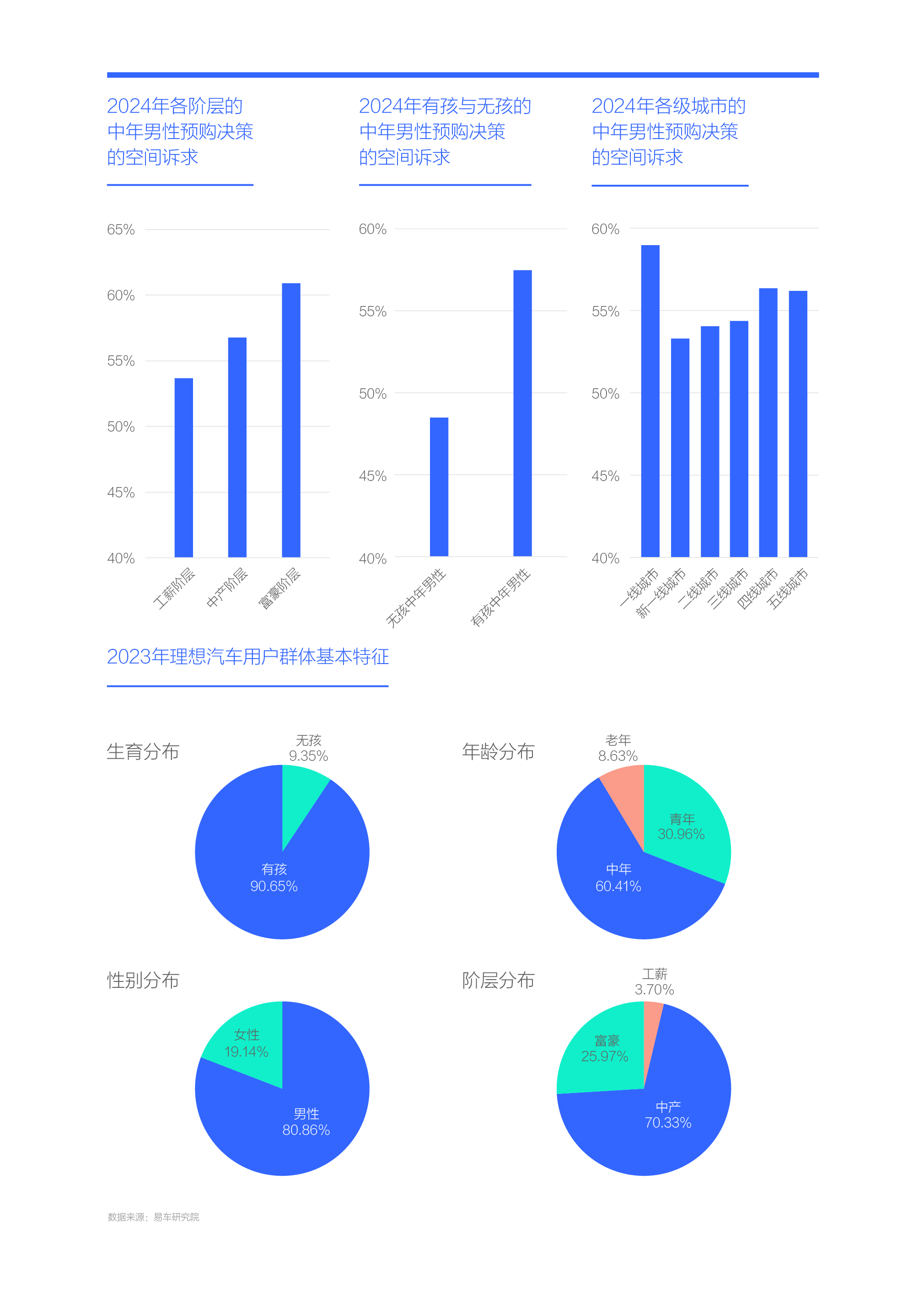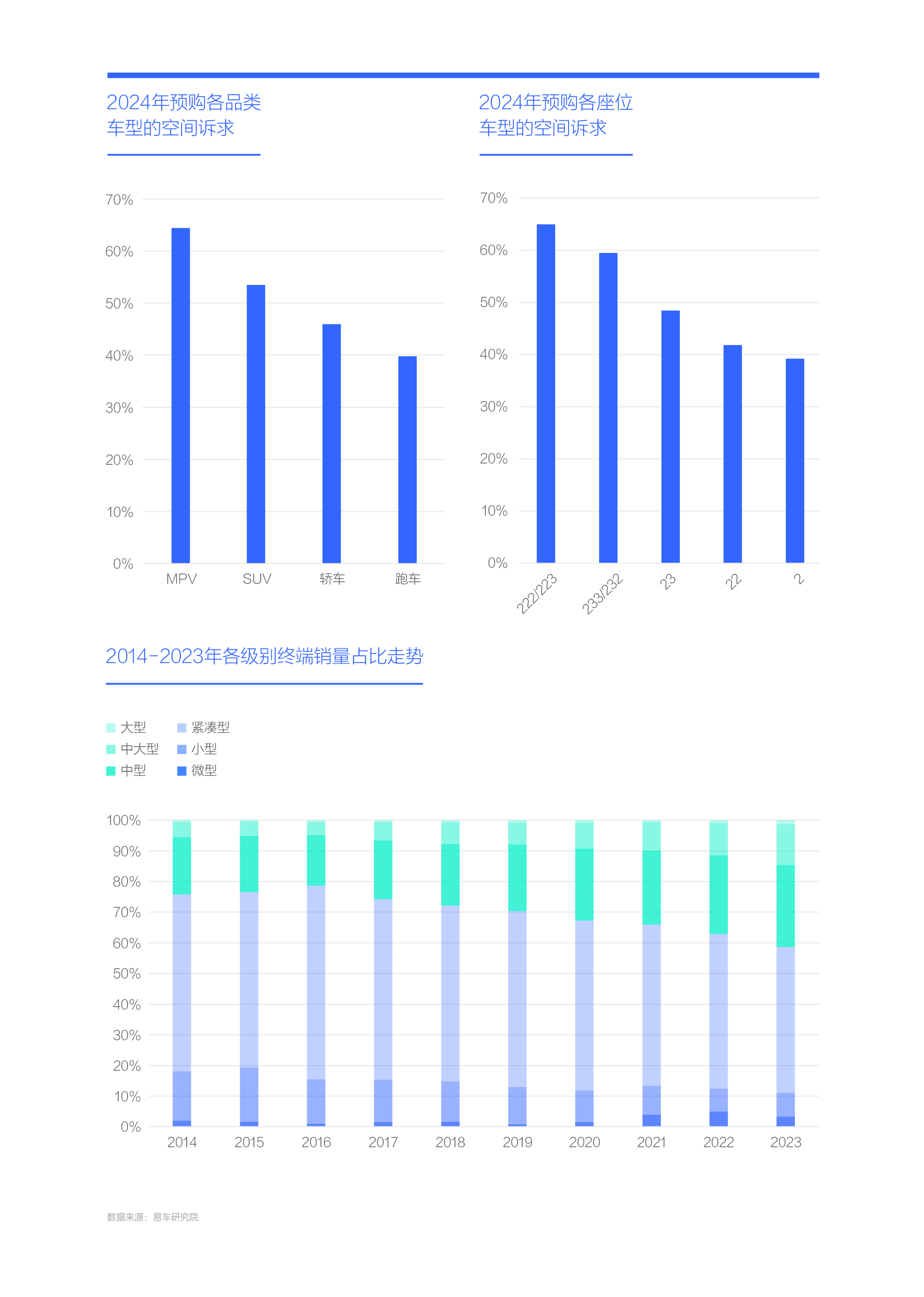 空间诉求:指用户在购车过程中对驾驶、乘坐、储物、休息、娱乐与互动等所需空间的大小、布局与功能等的要求 在全球车市,空间一直是车企重点研究的领域,因为除了造型,空间是用户在线下买车时最能直观感触到的。空间体验效果的好坏,对购车决策有很大影响。在中国车市,用户与车企对空间更敏感,一是中国车市的大规模普及时间非常短,从2000年到如今的2024年,也就短短的二十多年,空间等直观卖点更容易引起关注。二是中国车市更以家庭用户为主,更关注空间。三是近几年取得显著效果的电气化、智能化,正不断促使中国车市滋生出新空间卖点……基于上述因素,易车研究院尝试撰写购车决策之空间篇洞察报告,争取给中国车市的广大车企与经销商等易车客户,多提供一份参考材料; 目前,对空间的定义集中大小、布局与功能三大维度:基于长、宽、高、轴距等具体参数构建的空间大小,衍生出微型、小型、紧凑型、中型、中大型、大型之不同级别的划分标准,该标准已成为目前广大车企定义产品的核心标准;基于驾驶室、乘坐室、后备箱等具体位置展开的空间布局,衍生出三厢车、两厢车、跨界车、SUV、MPV等不同品类的划分标准,该标准也已成为目前广大车企定义产品的核心标准;基于代步、自驾游、上下班、越野等具体场景提炼的空间功能,衍生出代步车、保姆车、越野车等不同类型的划分标准,该标准同样已成为目前广大车企定义产品的核心标准。对比智能化与电气化等新趋势,空间看似没什么技术含量,但在车企的产品定义中举足轻重; 易车研究院基于用户维度,并结合主流分类维度,将购车用户的空间诉求定义为用户在购车过程中对驾驶、乘坐、储物、休息、娱乐与互动等功能模块的空间要求; 本报告的研究数据以易车研究院的线上调研为主,2024年前三季度的总样本量超过5万份,并以易车大数据和易车研究院的线下调研数据为参考。 2024年中国乘用车(新车)市场的广大预购用户的空间诉求高达50.25%,电气化、智能化等新技术助力车企不断拓展出新空间卖点 在中国车市近二十多年的高速普及中,中国用户对空间一直是情有独钟,即便近几年女性化、单身化显著,但2024年的空间诉求仍高达50.25%; 在看车时,男性用户往往会率先坐进驾驶室,伸长双腿、摸摸头顶,体验下前排驾驶室的空间是否合适,妻子与孩子可能更倾向后排,体验抱孩子、伸懒腰等动作所需空间是否合适……中国的男女、老少等用户都非常关注空间,车企自然是不遗余力挖掘空间优势,近二十多年纷纷推出L车型/拉长/拉皮等大空间产品,尤其是海外车企,且屡试不爽。同期,车企积极营销空间优势,经常用“头顶到车顶有几指、膝盖到前排有几拳、后备箱能塞几个行李箱”等翔实素材生动描述自身产品的空间优势; 近几年,随着电气化、智能化等新技术的快速普及,以中国品牌为主的车企,挖掘与包装出了更多空间卖点,目前大家耳熟能详的“大彩电/大冰箱/大沙发、得房率、大平层”等新营销概念,本质上都在努力丰富和拓展空间卖点的内涵与外延。 目前,大众、别克、日产等不少车企的空间卖点与市场销量的脱节现象愈发严重,相关车企重构新空间竞争优势迫在眉睫 近二十年,中国车市最受益于空间卖点的莫过于大众汽车。2006年与2008年大众分别国产了“原汁原味”的紧凑型轿车速腾和中型轿车迈腾,但空间狭小,被卡罗拉、凯越、雅阁、凯美瑞等空间优势突出的竞品压着打。2008年大众果断国产了主打“大空间”的紧凑型轿车朗逸与新宝来,大众的市场地位瞬间变被动为主动。2008-2013年,大众快速完成了全系轿车的“大空间升级”,尤其是新迈腾与新帕萨特两款同样主打“大空间”的旗舰产品的投放,开启了大众遥遥领先模式。2017-2019年,大众又马不停蹄投放大量同样主打“大空间”的SUV车型,助力大众品牌的市场销量快速突破300万辆; 十多年后的2024年,大众汽车的各级产品仍在不遗余力突出空间优势,且是熟悉的味道与配方,理论上该策略与中国车市当下仍旧强烈的空间诉求一脉相承,大众汽车的市场销量理应持续坚挺,但实际表现恰恰相反,2019-2023年大众汽车的终端销量由320万辆下滑至220万辆,足足少了100万辆,期间朗逸、速腾、迈腾、帕萨特等在售主力车型的市场销量纷纷大幅下滑且被迫大规模降价促销,2024年的销量只会更惨。除了大众汽车,包括原本也纷纷受益于“大空间”的别克、日产、哈弗等品牌,都不约而同遭遇了市场销量大幅下滑的挑战; 空间卖点与市场销量愈演愈烈的脱节现象,大体说明两种可能:一是空间卖点不重要了,且相关车企的其它更重要的卖点不突出,导致销量大幅下滑。由于其它卖点不在本篇讨论范畴,我们暂不涉及,不过我们开篇就指出,空间仍是目前中国车市的核心卖点,所以,第一种假设不成立;二是空间卖点变了,即大众、日产、别克等车企曾经基于燃油车的屡试不爽的拉长策略,已经无法有效满足当下用户的新空间诉求了。结合理想、问界等同样主打“大空间”,但销量快速提升的案例来看,第二种假设成立的概率很高,且在本篇讨论范畴,另外一旦在该假设下有新发现,将给车企提供巨大的借鉴价值; 为了探究是否存在新空间卖点,我们须要搞清楚两个基础问题:一是对空间感兴趣的用户发生了哪些变化,二是对空间感兴趣的用户的变化如何影响产品