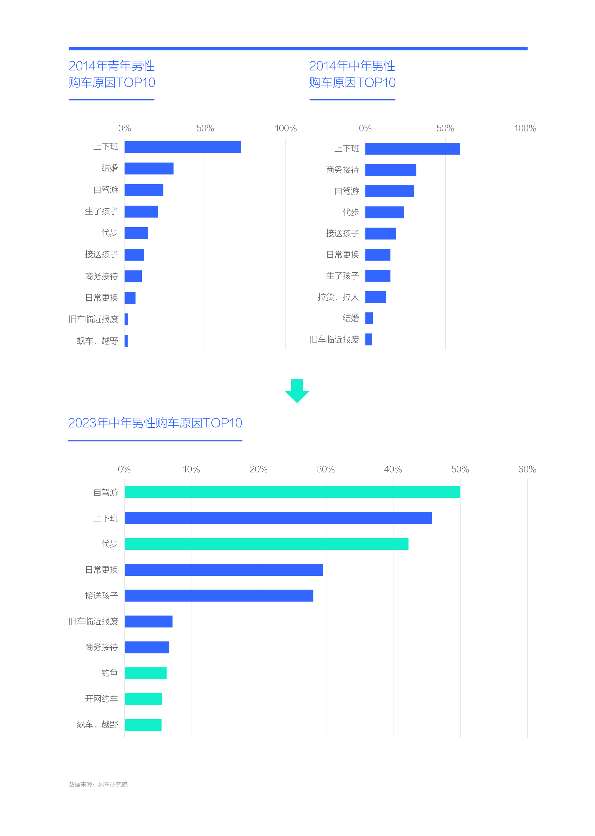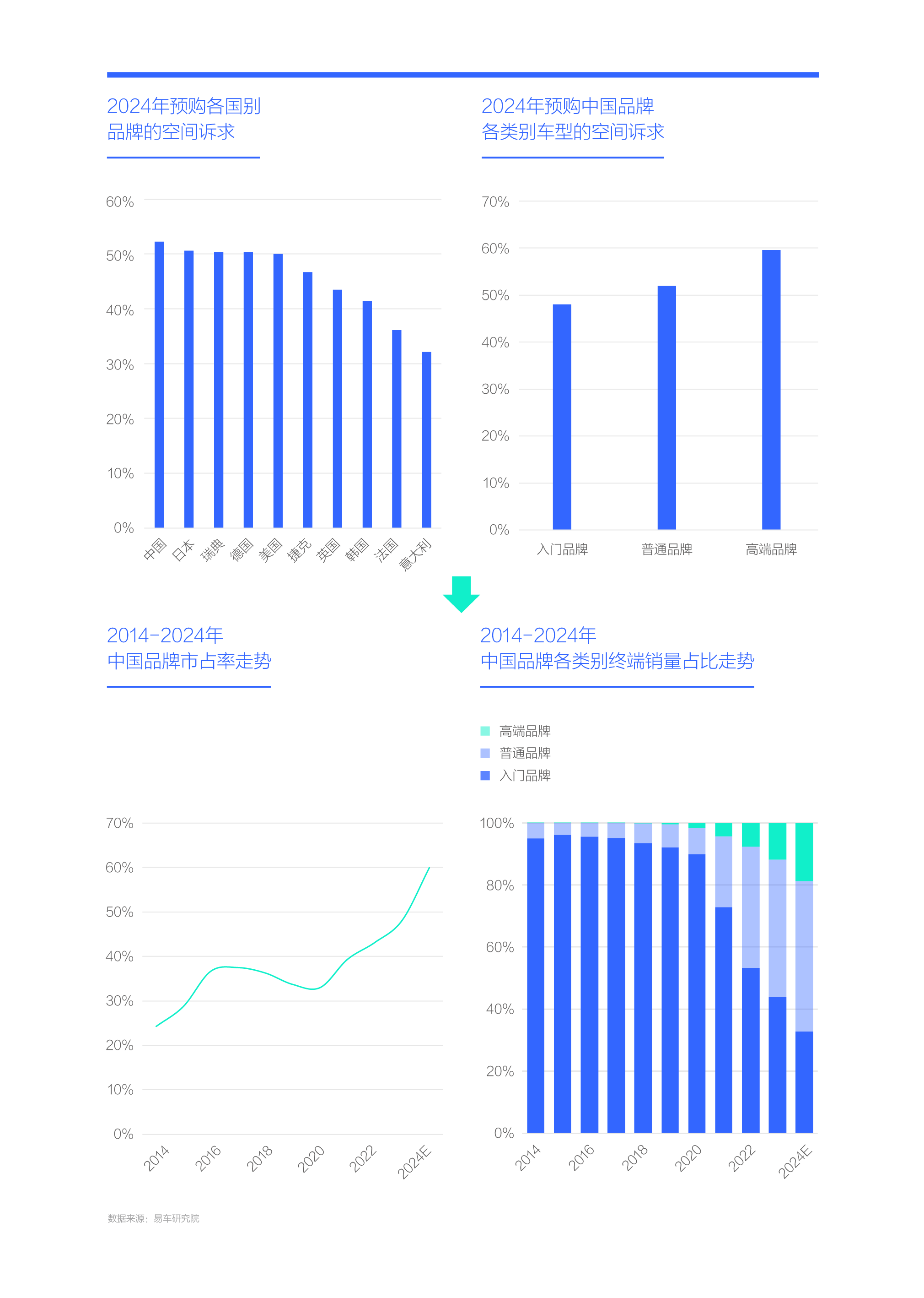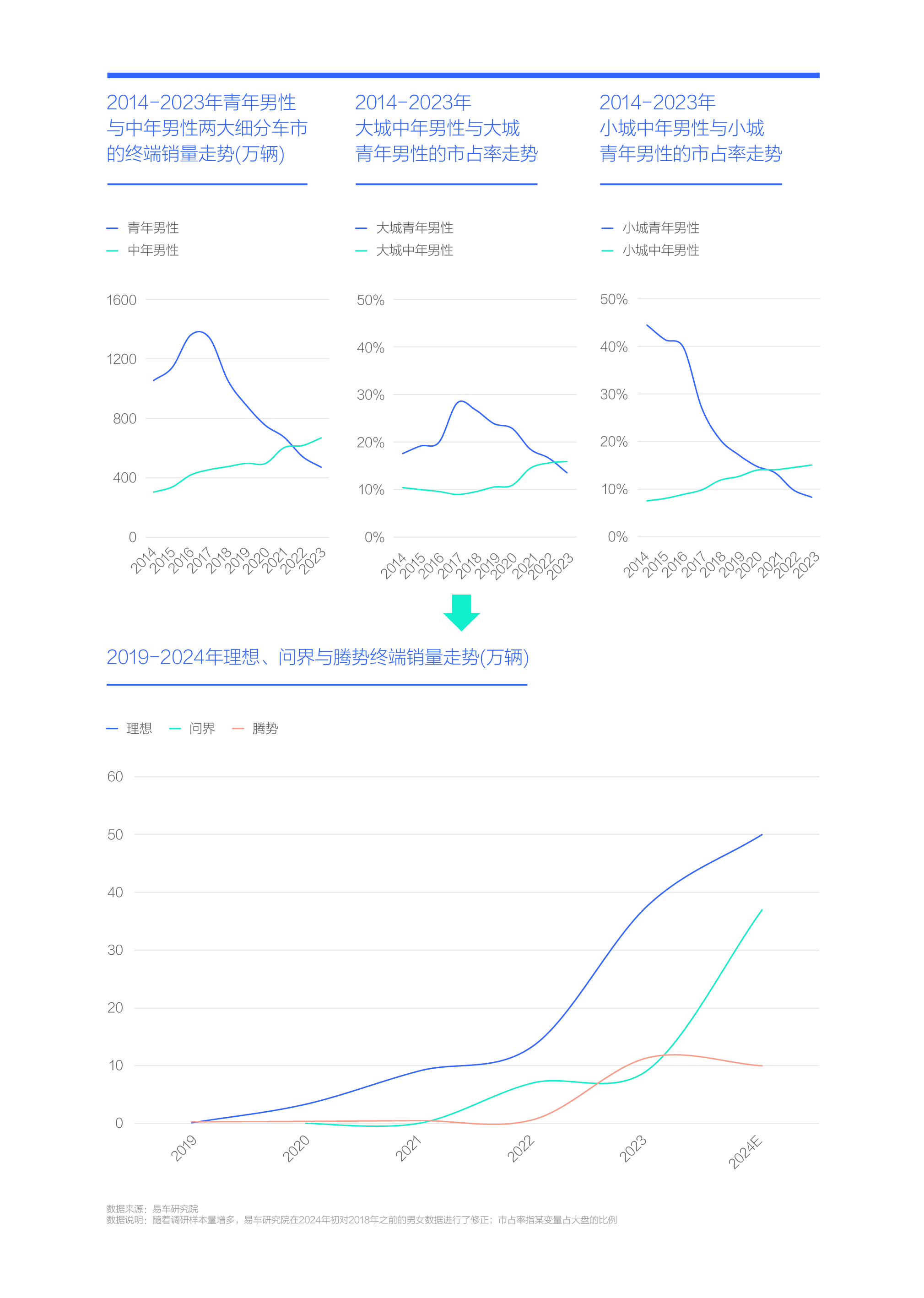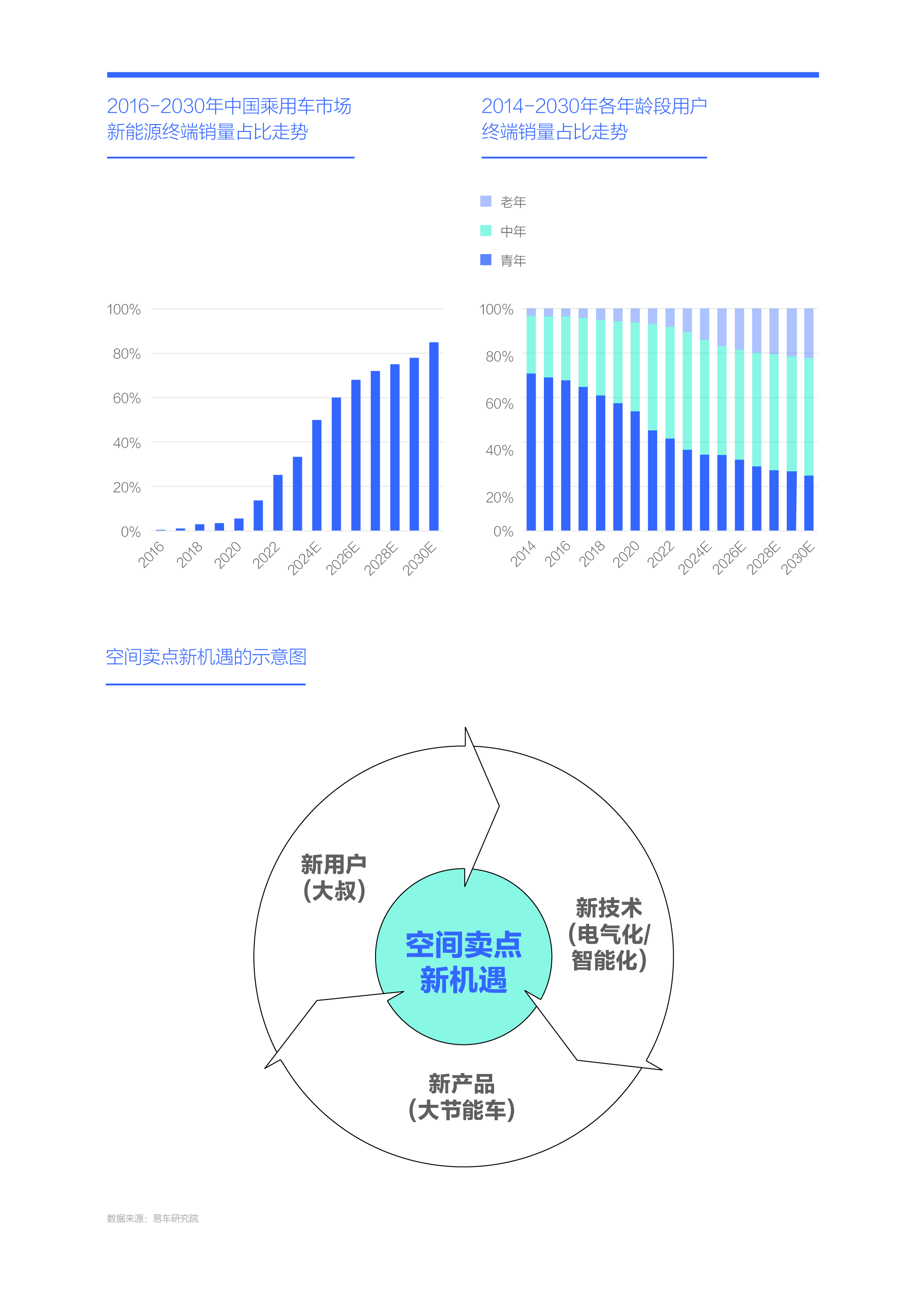 空间诉求:指用户在购车过程中对驾驶、乘坐、储物、休息、娱乐与互动等所需空间的大小、布局与功能等的要求 在全球车市,空间一直是车企重点研究的领域,因为除了造型,空间是用户在线下买车时最能直观感触到的。空间体验效果的好坏,对购车决策有很大影响。在中国车市,用户与车企对空间更敏感,一是中国车市的大规模普及时间非常短,从2000年到如今的2024年,也就短短的二十多年,空间等直观卖点更容易引起关注。二是中国车市更以家庭用户为主,更关注空间。三是近几年取得显著效果的电气化、智能化,正不断促使中国车市滋生出新空间卖点……基于上述因素,易车研究院尝试撰写购车决策之空间篇洞察报告,争取给中国车市的广大车企与经销商等易车客户,多提供一份参考材料; 目前,对空间的定义集中大小、布局与功能三大维度:基于长、宽、高、轴距等具体参数构建的空间大小,衍生出微型、小型、紧凑型、中型、中大型、大型之不同级别的划分标准,该标准已成为目前广大车企定义产品的核心标准;基于驾驶室、乘坐室、后备箱等具体位置展开的空间布局,衍生出三厢车、两厢车、跨界车、SUV、MPV等不同品类的划分标准,该标准也已成为目前广大车企定义产品的核心标准;基于代步、自驾游、上下班、越野等具体场景提炼的空间功能,衍生出代步车、保姆车、越野车等不同类型的划分标准,该标准同样已成为目前广大车企定义产品的核心标准。对比智能化与电气化等新趋势,空间看似没什么技术含量,但在车企的产品定义中举足轻重; 易车研究院基于用户维度,并结合主流分类维度,将购车用户的空间诉求定义为用户在购车过程中对驾驶、乘坐、储物、休息、娱乐与互动等功能模块的空间要求; 本报告的研究数据以易车研究院的线上调研为主,2024年前三季度的总样本量超过5万份,并以易车大数据和易车研究院的线下调研数据为参考。 2024年中国乘用车(新车)市场的广大预购用户的空间诉求高达50.25%,电气化、智能化等新技术助力车企不断拓展出新空间卖点 在中国车市近二十多年的高速普及中,中国用户对空间一直是情有独钟,即便近几年女性化、单身化显著,但2024年的空间诉求仍高达50.25%; 在看车时,男性用户往往会率先坐进驾驶室,伸长双腿、摸摸头顶,体验下前排驾驶室的空间是否合适,妻子与孩子可能更倾向后排,体验抱孩子、伸懒腰等动作所需空间是否合适……中国的男女、老少等用户都非常关注空间,车企自然是不遗余力挖掘空间优势,近二十多年纷纷推出L车型/拉长/拉皮等大空间产品,尤其是海外车企,且屡试不爽。同期,车企积极营销空间优势,经常用“头顶到车顶有几指、膝盖到前排有几拳、后备箱能塞几个行李箱”等翔实素材生动描述自身产品的空间优势; 近几年,随着电气化、智能化等新技术的快速普及,以中国品牌为主的车企,挖掘与包装出了更多空间卖点,目前大家耳熟能详的“大彩电/大冰箱/大沙发、得房率、大平层”等新营销概念,本质上都在努力丰富和拓展空间卖点的内涵与外延。 目前,大众、别克、日产等不少车企的空间卖点与市场销量的脱节现象愈发严重,相关车企重构新空间竞争优势迫在眉睫 近二十年,中国车市最受益于空间卖点的莫过于大众汽车。2006年与2008年大众分别国产了“原汁原味”的紧凑型轿车速腾和中型轿车迈腾,但空间狭小,被卡罗拉、凯越、雅阁、凯美瑞等空间优势突出的竞品压着打。2008年大众果断国产了主打“大空间”的紧凑型轿车朗逸与新宝来,大众的市场地位瞬间变被动为主动。2008-2013年,大众快速完成了全系轿车的“大空间升级”,尤其是新迈腾与新帕萨特两款同样主打“大空间”的旗舰产品的投放,开启了大众遥遥领先模式。2017-2019年,大众又马不停蹄投放大量同样主打“大空间”的SUV车型,助力大众品牌的市场销量快速突破300万辆; 十多年后的2024年,大众汽车的各级产品仍在不遗余力突出空间优势,且是熟悉的味道与配方,理论上该策略与中国车市当下仍旧强烈的空间诉求一脉相承,大众汽车的市场销量理应持续坚挺,但实际表现恰恰相反,2019-2023年大众汽车的终端销量由320万辆下滑至220万辆,足足少了100万辆,期间朗逸、速腾、迈腾、帕萨特等在售主力车型的市场销量纷纷大幅下滑且被迫大规模降价促销,2024年的销量只会更惨。除了大众汽车,包括原本也纷纷受益于“大空间”的别克、日产、哈弗等品牌,都不约而同遭遇了市场销量大幅下滑的挑战; 空间卖点与市场销量愈演愈烈的脱节现象,大体说明两种可能:一是空间卖点不重要了,且相关车企的其它更重要的卖点不突出,导致销量大幅下滑。由于其它卖点不在本篇讨论范畴,我们暂不涉及,不过我们开篇就指出,空间仍是目前中国车市的核心卖点,所以,第一种假设不成立;二是空间卖点变了,即大众、日产、别克等车企曾经基于燃油车的屡试不爽的拉长策略,已经无法有效满足当下用户的新空间诉求了。结合理想、问界等同样主打“大空间”,但销量快速提升的案例来看,第二种假设成立的概率很高,且在本篇讨论范畴,另外一旦在该假设下有新发现,将给车企提供巨大的借鉴价值; 为了探究是否存在新空间卖点,我们须要搞清楚两个基础问题:一是对空间感兴趣的用户发生了哪些变化,二是对空间感兴趣的用户的变化如何影响产品