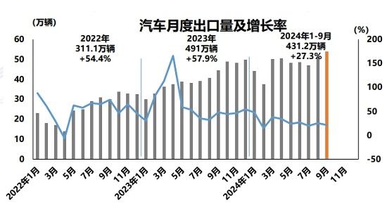 值得一提的是,出口也是我国汽车销量增长的推动力之一。9月,我国汽车出口53.9万辆,环比增长5.4%,同比增长21.4%。1至9月,我国汽车出口431.2万辆,同比增长27.3%;其中乘用车出口363.3万辆,同比增长28%。