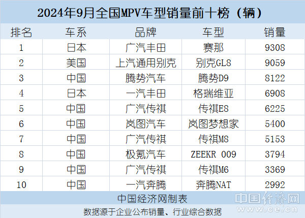 一直以来,MPV市场都有较强的马太效应。9月,排名前十的车型合计销量超过6万辆,占比62.2%。而这10款MPV基本被丰田、别克、传祺与腾势四个品牌瓜分,占比接近80%。 9月,丰田品牌凭借赛那与格瑞维亚的强势表现,一举超过传祺MPV家族,成为国内MPV市场的新晋王者;别克GL8通过推出陆尊PHEV,实现力挽狂澜,不断开拓蓝海、开创品类、自我进化;岚图梦想家借力华为,实现排名持续上升。 根据乘联分会日前发布的数据,2024年9月国内MPV市场零售9.7万辆,同比下降3.8%,环比增长6.0%。一直以来,MPV市场都有较强的马太效应,排名前十的车型在9月的销量合计超过6万辆,占比62.2%。如果车企推出的产品不能冲到前十,那么在市场上的生存空间基本很小。 9月,MPV市场前十车型基本被丰田、别克、传祺与腾势四个品牌瓜分,四品牌销量合计占比接近80%。 从具体车型看,9月赛那以9308辆的成绩,首次夺得MPV市场冠军;其姊妹车型格瑞维亚月销6908辆,二者合计达到16216辆。凭借广汽丰田赛那与一汽丰田格瑞维亚的强势表现,丰田品牌在9月一举超过传祺MPV家族,成为国内MPV市场的新晋王者。 在新能源的浪潮下,赛那与格瑞维亚目前搭载的仍是油电混合动力,而不是插电混动,这显得有些“格格不入”;但驱动方式并未对其销量形成不利影响。 相比之下,别克GL8在轻混动力车型经历短暂冲击后,迅速做出反应,推出了陆尊PHEV。新车搭载了上汽通用汽车全新一代PHEV智电插混系统,在配置上全面升级,实现力挽狂澜。 数据显示,9月,别克GL8家族销量为9059辆,仅次于赛那,排名第二。另据别克方面提供的数据,GL8家族9月的终端销量为10590辆,在细分市场排名第一。 9月,别克GL8家族还迎来第200万辆整车下线,成为国内高端MPV市场首个产销突破200万辆的车型系列。从初代GL8入市至今,别克品牌在中国MPV市场深耕25年,以一个车型定义一个市场,不断开拓蓝海、开创品类、自我进化。 自主品牌方面,腾势D9销量为8122辆。今年以来,腾势D9一直占据前两名的位置,但9月罕见跌至第三名。有分析认为,目前腾势D9主销车型为DM-i插混,9月销量稍有下滑可能受到别克GL8陆尊PHEV的影响。 9月,广汽传祺依然有3款车型上榜前十,分别为传祺E8、传祺M8以及传祺M6,销量分别为6225辆、5153辆、3369辆。传祺E8实现对M8的反超,契合了当下的新能源浪潮,结合别克GL8陆尊PHEV与腾势D9的热销,一定程度上说明当下消费者对新能源MPV产品有比较强劲需求。 得益于在中国MPV市场的积淀,传祺MPV家族在9月的销量达到15969辆,1-9月累计销量达12.38万辆。近年来,传祺一直都是国内家用MPV佼佼者。今年4月,传祺与华为签署合作协议,联合发布了创“新”计划,双方重点围绕智能底盘、智能人机交互等多领域进行深度合作、研发并发布了轿车领域的“1Concept”概念车,未来还将在SUV、MPV领域推出新的旗舰产品。 广汽集团整车及海外业务本部中大型轿车系列产品总经理轩伟表示,传祺旗舰产品后续会以增程和华为智能化为主,在2025年、2026年陆续投放。华为智能汽车解决方案BU CEO靳玉志也表示,华为将助力传祺MPV、SUV和轿车等全品类车型的推出。有了华为的加持,传祺MPV家族无疑将会有更多的看点。 与华为有合作的MPV产品并不只有传祺,岚图梦想家就已搭载华为鸿蒙座舱和华为乾智驾系统。近期上市的全新岚图梦想家为用户带来了智慧出行移动空间,配合百万级魔毯底盘在内的多项同级第一,同级唯一的产品实力,有望掀起新一轮MPV革同辰潮。梦想家9月销量为5400辆,排名持续上升。 9月,岚图汽车共交付新车10001辆,这是继去年12月之后,岚图再一次站上月销过万辆的台阶。其中,全新岚图梦想家的销量占比超过半数。 极氪009 8月,极氪009刚刚冲进MPV销量前十榜单,排名第十;9月升至第八,销量为3794辆。近来,极氪汽车获得市场极大关注,其三电终身质保承诺让不少消费者吃下定心丸,同时凭借优秀的智能化技术、较高的配置以及三电水平赢得大批消费者青睐。10月1日,极氪汽车宣布,9月交付新车21333辆,再创历史新高,同比增长77%;1―9月累计交付142873辆,同比增长81%。 与此同时,极氪009正积极开拓海外市场。7月,全新极氪009在香港上市,并开启全球交付。按照计划,极氪2025年将正式进入日本市场,位于东京都市圈和关西地区的门店已开始布局,右舵版极氪X和极氪009将率先进入日本。(中国经济网记者 陈梦宇) (责任编辑:王治强 HF013)