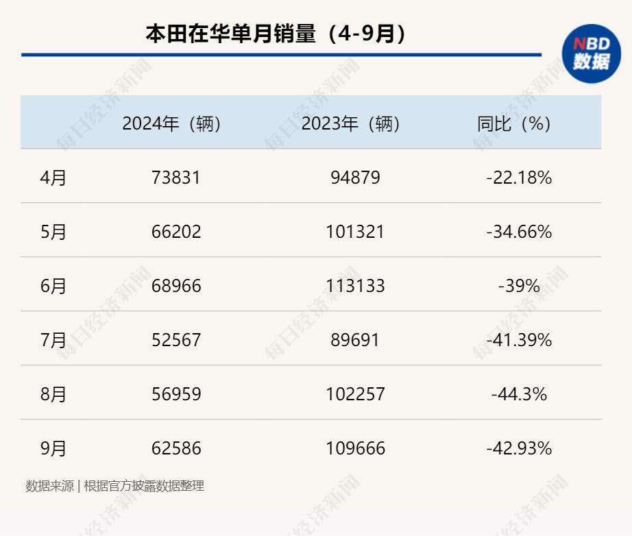 作为日系车企的代表之一,本田在中国市场正遭遇阵痛。 来自官方的数据显示,今年9月,本田在中国的终端汽车销量约为6.26万辆,较去年同期(10.97万辆)下滑了42.93%。这一数字不仅未能跑赢大盘,也远不及当月主流合资品牌零售增速(-22%)。而从前9个月整体数据来看,本田在华表现同样承压,终端汽车累计销量约为58.8万辆,同比下降29.3%。 实际上,自今年下半年以来,本田在中国市场中的销量一直未能回归正向增长轨道。从7月份开始,本田单月终端销量的同比降幅就已超过四成。今年7~9月,本田在华销量的同比增速分别为-41.39%、-44.3%、-42.93%。而在今年二季度,本田在华销量的同比增速也出现了高两位数下降。 制图:每经记者 裴健如 根据此前披露的信息,本田2024年在全球范围内的销量目标为412万辆。对于中国市场,本田暂未披露明确的销量目标。但若以2023年全年销量(123.42万辆)来推算,今年前9个月,本田在华累计销量仅完成了去年全年销量的约47.64%,尚不足五成。 “本田在中国市场中出现较高的销量降幅,应该有一部分原因来自于产品线。一方面,本田在新能源领域相对迟缓,建树不大,而中国市场的新能源车仍处于较快的增长之中,错失这部分销量增量,就会使其在销量上处于弱势。另一方面,本田在混动领域比较强势,但面临丰田等较强的竞争对手,市场份额的争夺不易。而且,其产品种类也有待进一步丰富。综合因素影响下,本田在华的销量可能会面临较大的压力。”中国汽车流通协会专家委员会成员颜景辉接受《每日经济新闻》记者采访时分析称。 值得注意的是,本田面临的困局在合资车企中或存在共性。乘联会最新数据显示,今年9月,主流合资品牌零售销量约53万辆,同比下降22%。其中,德系品牌零售份额为16.5%,同比下降3.6个百分点;日系品牌零售份额为12.6%,同比下降4.0个百分点;美系品牌市场零售份额达到5.7%,同比下降1.7个百分点。 与之相对应的是,当月,自主品牌零售销量约134万辆,同比增长25%,环比增长11%,自主品牌国内零售份额为63.5%,同比增长10.1个百分点。乘联会方面认为,自主品牌的亮眼表现,得益于其在新能源市场和出口市场获得了明显增量,头部传统车企转型升级表现优异。 颜景辉也解释称,“拿本田来说,它的产品线方向和种类有一些缺失,或者说有一些非常弱的地方。而这个弱的地方,比如说新能源,正是目前销量提升潜力很大的市场,这就会导致它在销量和份额的争夺中优势比较小”。 从本田的一系列调整和动作来看,其也意识到了问题所在。早在今年4月,本田发布了专为中国市场推出的全新电动品牌“烨”,欲通过e:N和“烨”两个不同的品牌,加速电动化转型,应对中国市场的竞争。 图片来源:每经记者 裴健如 摄(资料图) 彼时,本田技研工业株式会社执行役常务、中国本部长,本田技研工业(中国)投资有限公司总经理,本田技研科技(中国)有限公司总经理五十岚雅行曾表示:“我们认识到,在中国,本田在新能源产品阵营布局方面相对于市场有些缓慢。从经营层的角度来看,现在本田有两个策略:一是通过e:N和‘烨’两个纯电品牌,快速应对新能源车市场份额扩大的现状;二是现在燃油车销量降幅很大,我们会考虑是否在生产力方面作调整。这是我们现在面临的,也是需要去解决的两个问题。” 随后,在今年7月,本田中国宣布,将实行产能优化,加速电动化转型。调整后的本田在华总产能将由149万辆变为120万辆,具体举措包括关闭年产能为5万辆的广汽本田第四生产线,以及将年产能为24万辆的东风本田第二生产线停产休业。 今年10月11日,本田中国方面宣布,本田全球首个新能源工厂――东风本田新能源工厂正式投产。据悉,该工厂位于武汉经济技术开发区,占地面积约63万平方米,具备年产12万辆新能源乘用车生产能力,初期投产车型包括灵悉L、烨S7等多款电动车型。 按照规划,到2027年,本田在中国市场中的纯电动产品将达到10款,涉及e:N系列和“烨”品牌。到2035年,本田计划先于其他地域,在中国实现纯电动车销售占比100%的目标。 每日经济新闻 (责任编辑:郭健东 )