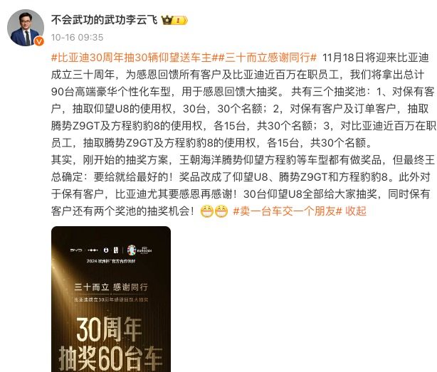 10月18日晚间,比亚迪发布《2024年员工持股计划(草案)》(以下简称《计划》),拟推持股计划,或惠及150位公司员工,涵盖中层管理人员、核心骨干员工等。 《计划》显示,此次员工持股计划以“份”作为认购单位,每份认购价格为1元,份额合计不超过2.2亿份,涉及的资金总额不超过2.2亿元,资金来源为员工合法薪酬、自筹资金,以及法律法规允许的其他方式。 图片来源:比亚迪公告 按照《计划》规定,本次员工持股计划的存续期为72个月,股票来源于二级市场购买,按10月17日比亚迪股票收盘价289.42元/股测算,可购买并持有的股票数量不超过76.014万股,占公司当前股本总额的比例不超过 0.0261%。股票解锁期分为五期,解锁时点分别为自公司公 告最后一笔标的股票购买完成之日起算满 12 个月、24 个月、36 个月、48 个月、 60 个月,每期解锁的标的股票比例均为20%。 据悉,《计划》实施完成后,比亚迪全部有效的员工持股计划所持有的股票总数累计不超过公司股本总额的10%,单个员工所持员工持股计划份额对应的股票总数累计不超过公司股本总额的1%。 此次《计划》的推行,需追溯到2023年12月。去年12月6日,比亚迪曾发布公告称,收到公司实际控制人、董事长兼总裁王传福《关于提议比亚迪股份有限公司回购公司A股股份的函》,提议以公司自有资金2亿元的总金额回购部分公司A股股份,将用于员工持股计划、股权激励计划或减少注册资本等。 图片来源:比亚迪公告 今年2月,比亚迪再次发布公告称,公司于2月22日收到王传福提议增加回购公司A股股份金额的函,由此前的人民币2亿元增加至了4亿元,将用于减少注册资本,具体由公司董事会依据有关法律法规决定。 从比亚迪发布的《计划》来看,其实际用于员工持股计划的回购资金在去年12月王传福提议的2亿元基础上增加了0.2亿元。 值得一提的是,除此次员工持股计划外,比亚迪在国庆假期前还给公司员工发放了“利润奖”。10月初,有消息称,多名比亚迪员工透露,他们国庆节前收到公司发放的一笔丰厚利润奖金,有人收到七八万元,更有甚者收到十余万元。 10月18日,《每日经济新闻》记者向比亚迪相关负责人处了解到,公司在国庆前确有给员工发放“利润奖”,发放金额与员工所处等级和事业部有关。“发放‘利润奖’前,我们有收到具体发放金额的邮件。”一位比亚迪员工向记者透露称。 官方数据显示,截至9月13日,比亚迪员工总数突破90万人。“到11月18日,比亚迪成立30周年之际,公司在职员工大概会有将近100万人。”比亚迪集团品牌及公关处总经理李云飞称。 就在此次《计划》发布前两天(10月16日),比亚迪还对外宣布,将于10月24日举行比亚迪成立30周年感恩回馈大抽奖活动,奖品为仰望U8、方程豹豹8,以及腾势Z9GT共90辆新车的使用权,其中60辆给用户,30辆给员工。“此次活动的举办,目的是感恩回馈比亚迪所有用户和比亚迪近百万在职员工。”李云飞解释称。 图片来源:同辰微博(@不会武功的武功李云飞) 据李云飞介绍,此次抽奖活动有三个奖池,其中,“感恩礼”奖品为30辆仰望U8使用权,参与对象为比亚迪旗下所有乘用车品牌保有客户(包含现任车主以及交全款待提车的车主);“相逢礼”奖品为15辆腾势Z9GT和15辆方程豹豹8使用权,参与对象为比亚迪旗下所有乘用车品牌保有客户及订单客户;第三大奖池参与对象为比亚迪近百万在职员工,奖品为15辆腾势Z9GT及15辆方程豹豹8的使用权。 每日经济新闻 (责任编辑:董萍萍 )