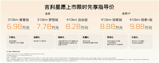 近日,吉利汽车集团正式宣布几何系列并入银河,首款A0级纯电小车吉利星愿正式上市。新车共推出星愿和星愿UP两个系列共5个版型,售价区间6.98万元-9.88万元。 在发布会现场,吉利汽车集团CEO淦家阅表示:“吉利新能源将推动内部资源深度整合与高效融合,聚焦银河品牌,打造‘一个’为主流用户服务的精品新能源产品品牌。同时,几何系列正式并入银河,‘GEOME’将成为银河的智能精品小车系列。未来,银河将聚焦主流新能源市场,产品矩阵覆盖A0级到C级,涵盖轿车、SUV、MPV等多种新能源车型。” 吉利星愿作为吉利银河系列首款A0级纯电小车,基于吉利全面领先的电动化、智能化体系力打造,紧抓细分市场用户痛点,以技术突破挑战物理极限。凭借一大设计创新、五大颠覆式创新、6项行业领先,21项同级唯一、超80项实用配置全系标配,吉利星愿刷新了行业对A0级电车的固有认知,让A0级电车也拥有B级车的用车体验,把美好出行生活带给全球用户。 市场需要什么样的A0级纯电精品车? 长期以来,A0级市场都没有一款真正意义上的“智能精品纯电小车”,现有车型普遍高级感不足、空间不够大、安全感不强、操控不灵动、车机不智能,用户只能“将就”。吉利星愿得到吉利领先的电动化、智能化体系力赋能,以代际领先的技术优势,颠覆传统,全面满足用户多样化需求。 吉利星愿基于GEA架构打造,将乘坐空间、储物能力、空间便利三大诉求合而为一,完成6大空间专题设计、10大细节优化,以A0级车身尺寸实现同级最大准B级乘坐空间、同级最强储物能力和同级最优空间便利。 吉利星愿座舱“得房率”高达85%,全系标配真五座的空间布局,让A0级小车也能轻松满足一家五口或五个好友一同出行的需求。同时乘坐5个1米8乘客,坐车也不拥挤。 多达36储物空间大大提升了用户存放物品的便利性,特别是20万以内电车最大的70L前备箱,可容纳20英寸的行李箱,放入榴莲等有异味的食物,也不会影响座舱内的空气质量。另外,吉利星愿还率先在A0级小车市场中采用MPV的空间设计理念,以大开口、无门槛、平地板三大免“钻”设计,提升用户上下车的便利性,对老人或儿童非常友好。 A0级纯电精品车的安全标准是什么? “安全”是吉利造车的第一优先级,面对以往A0级小车用户最缺乏的“安全感”,吉利星愿构建以电池为核心的全方位安全防护,做到高标准、全场景、全天候的安全守护。 吉利星愿搭载吉利银河专属的神盾电池安全系统,为全系标配的CTP电池包和宁德时代电芯,提供全方位安全防护。其以包括高强钢电池底护板、高安全电池防托底设计和18个温度传感器实时监测在内的3层垂直安全防护,保障电池整包“0”热扩散,以外层4横5纵底盘加强梁和内层“目”字形铝合金电池包围,最大化保障侧柱碰撞安全。同时,为确保能量密度比同级产品高11.4%的宁德时代电芯安全无忧,吉利星愿还搭载电池医生BMS 3.0和液冷式温控系统,实时监控电芯温度,避免热失控。 此外,吉利星愿以星甲笼式车身、井字形后副车架、三叶草泄力防护结构来保障整车结构安全,提升被动安全性能。 A0级纯电精品车,怎么做到好开、好停、又灵动? 对于以往A0级小车“可望不可及”的高质感驾控,吉利星愿采用了以11合1电驱+后驱+多连杆独悬+AI虚拟调校为核心技术路线的解决方案,最大化发挥小车的驾控潜力,成就高速有信心、变道不心慌、过坎不颠簸、转向很灵活、超车很轻松、脚下不打滑、停车更轻松的灵动驾控。 11合1智能电驱拥有同级最高集成度、最轻质量、最小体积,还拥有85kW最强动力和89%最高工况效率,使吉利星愿的最高车速可达140km/h,0~50km/h加速时间只有3.9s,同时做到百公里能耗只有10.7kWh。结合后驱、全系前后独悬和接近50:50轴荷比,吉利星愿无论面对城市道路、高速公路还是非铺装道路,都能拥有稳定的行驶姿态、柔和的隔振性能、丝滑的转向手感,驾驶更安全、操控更灵动。吉利星愿的麋鹿车速可达75km/h,湿地麋鹿车速也高达73.5km/h,甚至可以做出“水上漂移”的极限动作。 A0级纯电精品车,也能有自己的“智能时代” 吉利星愿搭载吉利自研的银河Flyme Auto和行业首发的无界空间,实现20万级车型的高价值智能座舱体验,车端、云端、手机端,三端互联,智慧无界。 银河Flyme Auto操作简单易上手,支持壁纸桌面DIY和Dock栏快捷操作、小窗模式、便捷卡片自定义,SmartBar快速切换后台应用等,还可全屏手势触控、全场景可见即可说,操作方式与智能手机一致,“零学习成本”即可玩转车机。支持同级领先的Flyme Link手车互联、Hicar和Carlink,支持80%的手机实现无感连接,手机上的应用可自动流转到车机。中控14.6英寸高清大屏分辨率高达1920×1080px,刷新率达到60Hz,画面清晰细腻,带来影院级的画面质感。 行业首发的“无界空间”带给用户海量应用无限扩展,视频“0”延迟“0”缓冲、常用常新的车机体验。结合同级唯一的银河Flyme Auto,吉利星愿甚至可以通过手机模拟手柄,变身沉浸游戏室;或以内置AI功能提供个性化体验,随时随地开启灵感创作,为用户打造出融合全场景、全感官的互动新境界。 吉利星愿的正式上市,进一步丰富与完善了吉利银河系列的产品矩阵,让吉利全新的智能科技覆盖到A0级小车市场,“高质优价”的智能精品车将为更广泛的主流消费者提供更美好的出行体验,引领细分市场进入“高价值竞争”