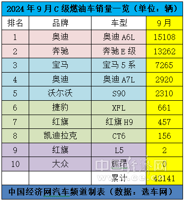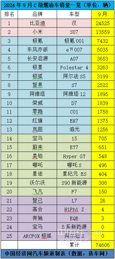 受数据源更新的影响,记者主要以9月单月数据为基础,分析国产C级车的现状。9月,国产C级车的累计销量为116747辆,环比上个月上涨26.35%;其中,燃油车和新能源车的销量之和分别为42141辆、74606辆,在C级车总销量中的占比分别为36.1%、63.9%。 在燃油车板块,“德系三强”依然稳居9月销量榜单前三甲:奥迪A6L再次拿下月度销量冠军,奔驰E级同样突破万辆的关口,宝马5系重新回到此前的水平;在新能源板块,比亚迪汉继续实现断层式领先,小米SU7已连续4个月达成破万辆的交付目标。 受数据源更新的影响,中国经济网记者以9月单月数据为基础,分析国产C级车的现状。9月,国产C级车的累计销量为116747辆,环比上个月上涨26.35%。其中,燃油车和新能源车的销量之和分别为42141辆、74606辆,在C级车总销量中的占比分别为36.1%、63.9%。 在燃油车板块,熟悉的“老面孔”延续着上个月的销量座次,“德系三强”依然稳居前三甲。其中,奥迪A6L再次拿下C级车市场的月度销量冠军。数据显现,9月,奥迪A6L的销量为15108辆。奔驰E级的单月销量同样突破万辆的关口。数据显示,9月,奔驰E级的销量为13262辆。宝马5系的9月销量重新回到此前7000辆的水平,达7265辆。 紧随其后,“南奥迪”――A7L的单月销量依旧稳定地保持在2000-3000辆之间。数据显示,9月,奥迪A7L的销量为2920辆。与奥迪A7L“师出同门”的大众辉昂,9月销量再次“归零”。 欲与“德系三强”叫板的红旗H9,在今年北京车展期间推出年度新款后,单月销量曾在4-6月突破1000辆,如今却难有起色。数据显示,9月,红旗H9的销量为457辆。 作为二线高档汽车品牌的旗舰车型,沃尔沃S90和凯迪拉克CT6则鲜有亮点可言。数据显示,9月,沃尔沃S90和凯迪拉克CT6的销量分别为2310辆、661辆。 在新能源板块,又有一款新车型――高合HiPhi Z,出现在销量榜单中。高合一度被视为新能源汽车行业的明星企业,如今正遭遇经营困境。 10月20日,高合汽车母公司――华人运通临时管理人发布《华人运通(江苏)技术有限公司等十六家公司职工债权上海现场登记补充公告(二) 》显示,临时管理人9月24日曾发布《华人运通(江苏)技术有限公司、华人运通控股(上海)有限公司及下属关联企业职工债权登记/预登记特别公告》,请相关公司已离职员工按照公告指引向临时管理人登记或预登记职工债权,但其中的书面材料“现场提交”方式安排在盐城。为了方便离职员工登记或预登记职工债权,临时管理人在上海设立了现场接待点,允许离职员工在规定的时间内前往提交书面资料。 事实上,高合汽车也在积极开展“自救”工作。9月13日,高合汽车创始人丁磊曾在直播间回应了公司重整进展、用户情况、公司价值等,且称自己“没有跑路,还在公司”。 与高合汽车形成鲜明对照的是,国内新能源汽车市场持续保持高速增长的态势。聚焦国产C级车市场,比亚迪汉继续实现断层式领先。数据显示,9月,汉的销量为24525辆。 自带流量的小米SU7的9月销量再次站上万辆台阶达13559辆,目前已连续4个月达成破万辆的交付目标。据介绍,10月,小米汽车工厂将持续提产,单月生产目标冲刺2万辆。小米汽车官微称,预计小米汽车将在11月提前完成全年10万辆交付目标。 东风亦派eπ007、长安启源A07、极星Polestar 4、极狐阿尔法S5、智界S7 、阿维塔12、荣威 D7、零跑C01、红旗 EH7、岚图追光等位列第二梯队,10款车型在9月的销量分别为5035辆、3653辆、3263辆、3199辆、2522辆、1895辆、1839辆、1758辆、1375辆、1256辆。 在第三梯队,宝马 i5、蔚来ET7、昊铂 Hyper GT、哪吒S、星途星纪元 ES、沃尔沃S90新能源、飞凡F7等7款产品,在9月的销量分别为705辆、651辆、548辆、496辆、404辆、308辆、150辆。(中国经济网记者 王跃跃) (责任编辑:董萍萍 )