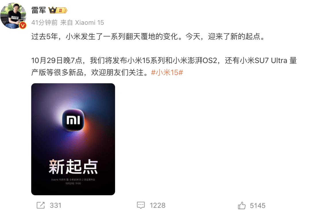 小米创始人雷军在微博上宣布,将于10月29日发布小米15系列、小米澎湃OS2。这是小米15系列首次正式发布,此前已多次登上热搜。小米公司高管表示,新品将是小米的新起点。此外,小米SU7 Ultra量产版也将在10月29日发布 ...
