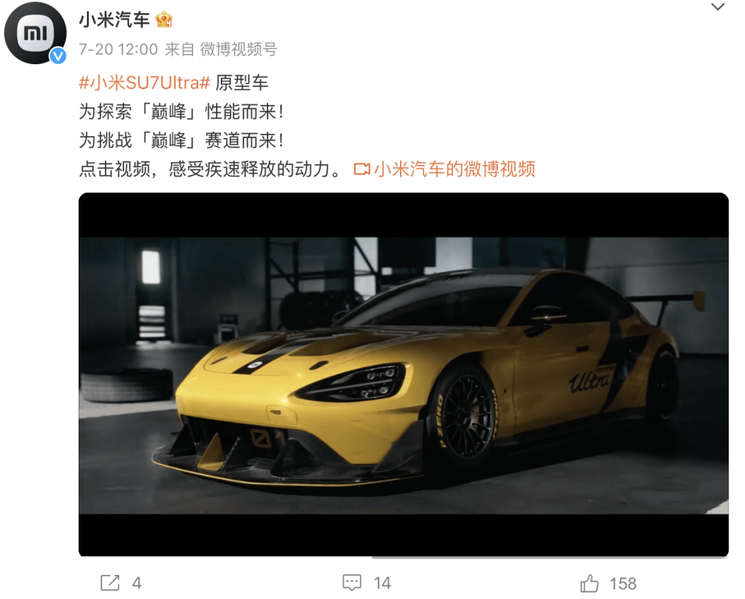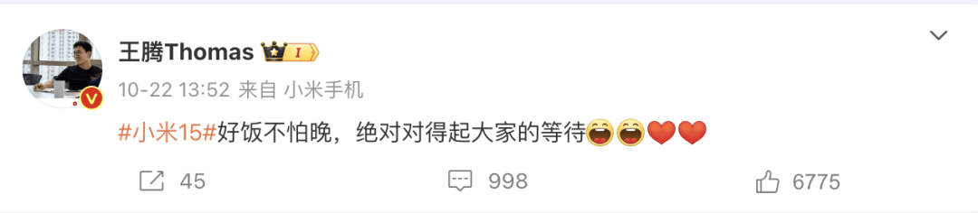 雷军最新宣布。 10月24日,雷军在其微博上宣布,将于10月29日发布小米15系列、小米澎湃OS2。 此前,小米15已多次登上热搜,但小米官方迟迟未正式发布新品。针对这一情况,小米公司王腾此前曾在社交媒体上表示:“好饭不怕晚,小米15绝对对得起大家的等待。” 对于即将发布的新品,雷军、王腾等均表示将是小米的新起点。 此外,雷军还在微博中表示,小米SU7 Ultra量产版也将在10月29日发布。据悉,小米SU7 Ultra是小米汽车推出的一款高性能纯电动车型。此前,小米曾发布了小米SU7 Ultra原型车。 高盛曾对小米SU7 Ultra作出预测,预计将在明年售出4000辆,平均售价约80万元人民币,贡献公司电动汽车收入的5%。 本文首发于微信公众号:证券时报。文章内容属作者个人观点,不代表西瓜财经立场。投资者据此操作,风险请自担。 (责任编辑:宋政 HN002)