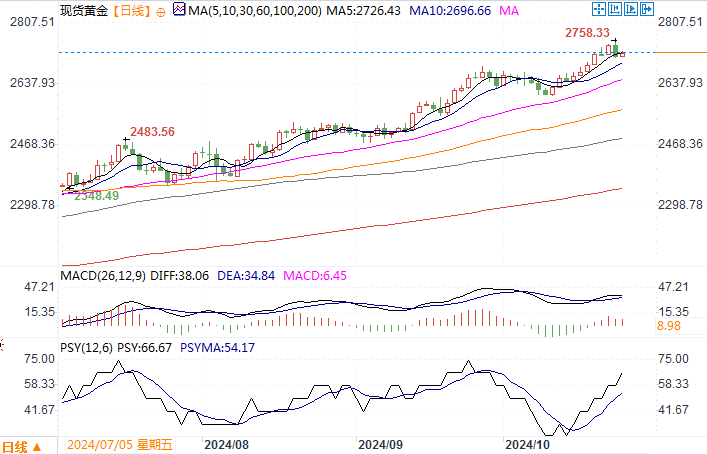 周三(10月23日),现货金下跌1.2%至每盎司2,714.55美元,盘初曾触及2,758.37美元的纪录高位。由于美元走强和美国公债收益率上升,金价在周三创下历史新高后遭获利盘打压出现冲高回落调整。 周三的金融市场上,由于美国总统大选前的对冲活动,以及对美联储未来几个月料不会积极降息的押注,美债收益率飙升,指标美国10年期公债收益率上升3.4个基点至4.24%,此前曾触及三个月高位4.26%。而美元指数也触及两个半月高位。这导致现货黄金高位出现获利回吐调整性回落。目前需关注的焦点要放在还有两周就要揭晓的美国大选上。两党候选人选情民调仍呈胶着状态,此前曾传出共和党特朗普胜出面大。若特朗普胜出,其推行的加征关税策略,被认为将会再度推高通胀,而且将造成美元继续走强。如果市场预计哈里斯获胜,考虑到她的政策被认为通胀效应较小,美元和收益率可能会有所回调,则有利于黄金。在美国大选结果揭晓之前,政治消息面的变动短期内将会对黄金产生较大的影响。