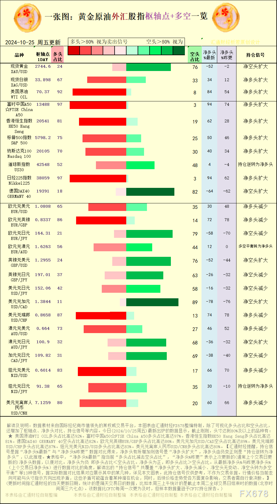 一张图:2024/10/25黄金原油外汇股指“枢纽点+多空持仓信号”一览。今日(2024/10/25周五)最新出炉的数据显示,截止刚刚,头寸达到80%及以上的品种有:★ 美国原油WTI OIL多头占比高达92%。富时中国A50☆FTSE China A50多头占比高达97%。香港恒生指数HK50 Hang Seng多头占比高达81%。德国DAX40 GERMANY 40空头占比高达82%。欧元兑英镑EUR/GBP多头占比高达86%。美元兑加元USD/CAD空头占比高达89%。美元兑瑞郎USD/CHF多头占比高达87%。纽元兑美元NZD/USD多头占比高达83%。美元兑离岸人民币USD/CNH多头占比高达80%。