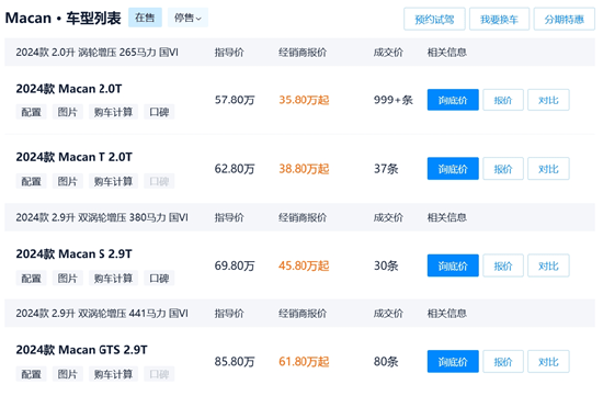 文 | 同辰科技 张俊 保时捷的售价再创新低。 同辰科技获悉,目前深圳经销商给出的Macan报价跌破了40万元――例如2024款Macan 2.0T的厂商指导价为57.80万,有深圳经销商给出了最低35.80万元的裸车报价,相当于六折优惠。另外,Taycan、Panamera等多款车型也在大促销。 然而,持续降价未能挽救保时捷的销量。近期,保时捷公布了今年前三季度销量,全球销量同比下降7%。中国市场最为惨淡,销量暴跌29%。其中,Taycan销量同比暴跌50%,Macan和Panamera的销量也均同比下降20%。此前,中国曾连续多年是保时捷的全球最大市场,而现在已降至第三位。 就在上个月,保时捷刚刚更换了中国市场总裁及首席执行官。销量崩盘之下,他能否力挽狂澜? 经销商破防,报价直逼35万 今年前三季度,保时捷的多款车型遭遇了销售困境。 比如纯电轿车Taycan,今年前三季度的销量仅为14042辆,同比暴跌50%,在几款车型中销量最低;Panamera销量也不理想,同比下降20%;Macan同比下滑20%…… 而这个成绩还是在多个车型大降价的背景下取得的。 同辰科技在汽车之家上看到,保时捷Macan的厂商指导价为57.80万-85.80万元,而深圳经销商的报价则为35.80万-61.80万元。其中2024款Macan 2.0T的厂商指导价为57.80万,而深圳一家经销商甚至给出了最低35.80万元的裸车报价,相当于打了六折;2024款 Macan T 2.0T的厂商指导价为62.80万元,多家深圳经销商给出了最低38.80万的裸车报价,同样打了六折。 针对上述报价,上述经销商强调此为限时促销价,不过同辰科技在这款车型的深圳价格走势图上看到,此前有经销商还给过34万元的更低报价。 同时,保时捷Taycan也在大降价,厂商指导价为89.80-199.80万元,深圳经销商报价则为58.82-173.50万元。其中2024款 Taycan 4 Cross Turismo指导价为100.80万元,深圳经销商最低报价为74.50万元,相当于打了七四折。 Panamera的厂商指导价为99.80-247.60万元,经销商报价为63.00-202.80万元。其中2024款 Panamera 2.9T指导价为113.80万元,经销商最低报价为89.60万元,打了七八折。 连续暴跌,中国市场“沦陷” 降价背后,映射出保时捷惨淡的业绩。近日,其公布了今年前三季度的销量数据。 数据显示,2024年前三季度保时捷全球销量为226026辆,同比下滑7%。具体来看,保时捷在德国本土市场销量为26838辆,同比增长8%;在欧洲市场(德国除外)销量为52465辆,同比增长1%;不过其最大市场北美销量却同比下滑5%至61471辆;中国市场则更为惨淡,销量为43280辆,同比下滑29%。 对于中国市场的销量下滑,保时捷方面解释称,主要原因是持续紧张的价格竞争以及保时捷专注于以价值为导向的销售策略。 这个理由难以掩盖保时捷在中国市场的溃败。自从2015年开始,中国市场就成为其全球最大单一市场。但到了2022年,其在中国的销量开始连续下滑。 根据数据统计,2022年,保时捷中国市场交付量为93286辆,同比下滑2.5%,成为其全球唯一下滑的市场;2023年,保时捷中国市场交付7.93万辆,同比下滑15%,再次成为其全球唯一下滑的市场,并且跌幅进一步扩大。 而今年以来,保时捷在中国市场销量也呈现连续下滑态势。今年一季度,同比降幅近25%;今年二季度,同比下降近42%……从今年上半年来看,保时捷中国市场销量仅为29551辆,降幅达到了33%。 销量崩塌背后,业内人士分析出两方面原因: 第一是保时捷的新能源转型并不理想。目前保时捷在国内在售五款燃油车和两款纯电车,其中燃油车包括中大型轿车保时捷Panamera、跑车保时捷718、中型SUV保时捷Macan、中大型SUV保时捷Cayenne以及跑车保时捷911,纯电车包括中大型轿车保时捷Taycan和中型SUV保时捷Macan EV,其车型组合依然以燃油车为主。 第二是保时捷电动车型与同等价位的国产新能源车型相比,优势并不明显。尤其是随着多家国产品牌发力高端豪华市场,保时捷的高附加值已经无法支撑。 紧急换帅,暂未公开新举措 实际上,经销商们对销量遇冷的保时捷怨恨已久。 此前有消息称,保时捷中国为了完成销售任务,选择向经销商压库存,让经销商承受了巨大的资金压力,导致双方矛盾激化。今年5月,保时捷部分中国经销商发起抗议,甚至以停止提车的手段“逼宫”德国总部,要求保时捷给予补贴的同时更换中国高管。 后来,逼宫风波最终以保时捷中国与全体授权经销商发布联合声明而暂告一段落。双方在声明中表示,保时捷中国与经销商一同寻求有效的方式积极应对市场变化,包括但不限于商务政策、本土客户洞察、客户服务以及电动化转型等关键领域。 那么,豪华车的经销商们压力有多大? 今年8月底,全国排名第一的汽车经销商集团中升控股发布半年报,净利同比暴跌47.5%;全国排名第二的汽车经销商集团广汇汽车更是因连续20个交易日每日收盘价低于1元被摘牌退市。两大头部经销商都沦落至此,其他经销商的困境可见一斑。 而在今年7月,保时捷也顺应中国经销商的呼声,对中国市场的高管进行了调整。原保时捷中国总裁及首席执行官柯时迈(Michael Kirsch)被调走,由Alexander Pollich正式接任,全面负责品牌在中国内地、香港及澳门地区的业务。 资料显示,Alexander Pollich已在保时捷任职23年,曾出任保时捷加拿大与英国的首席执行官,以及保时捷德国的执行董事会主席。保时捷全球执行董事会成员,销售与市场负责人冯佩德(Detlev von Platen)表示:“我们很高兴由Pollich掌印极具挑战的中国市场,他是一位经验丰富的销售专家,将进一步提升保时捷品牌在中国