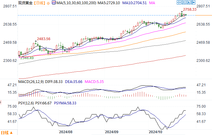 周四(10月24日),现货金上涨0.7%,收盘报每盎司2,735.55美元,修复了前一个交易日部分跌幅。 周四美国公布的上周首次申请失业救济人数降至22.7万人,低于接受路透调查的经济学家预计的24.2万人,但连续申请失业救济人数则升至近三年新高。这说明美国失业之后较难再找到就业机会。数据公布后,指标美国10年期债券收益率在上一交易日触及4.26%的三个月来最高点后下跌4.6个基点,至4.196%。衡量美元兑一篮子货币汇率的美元指数跌0.37%,报104.05,为连续三个交易日上涨后首次下跌。接下来,国际上以下一些大事件将可能继续凸显黄金作为传统避险资产的吸引力。首先,美国11月5日的总统大选在即,前总统特朗普与副总统哈里斯的竞争加剧了市场对财政赤字扩大的担忧。这种担忧将进一步增加了投资者对黄金的兴趣。其次,近期以色列和黎巴嫩南部的冲突升级,尤其是以色列针对伊朗的空袭计划,进一步刺激了市场避险需求。中东局势的不确定性不仅推高了原油价格,也为黄金提供了更多的买入动力。在地缘政治风险加剧的背景下,黄金无疑继续扮演着重要的避险角色。最后也是一直来影响黄金走势的主线暨美联储货币政策的动向。根据知名机构的分析,市场已基本消化了美联储将在11月降息25个基点的预期,而且12月份继续降25个基点的预期概率也不低。美元利率成本的持续下降,无疑在中长线的角度看有利于黄金的向上发展。然而,由于美国经济数据表现强劲,市场对更激进的货币宽松措施的期望有所降温,这在一定程度上限制了黄金的涨幅。需要防范黄金出现调整性回落行情风险。