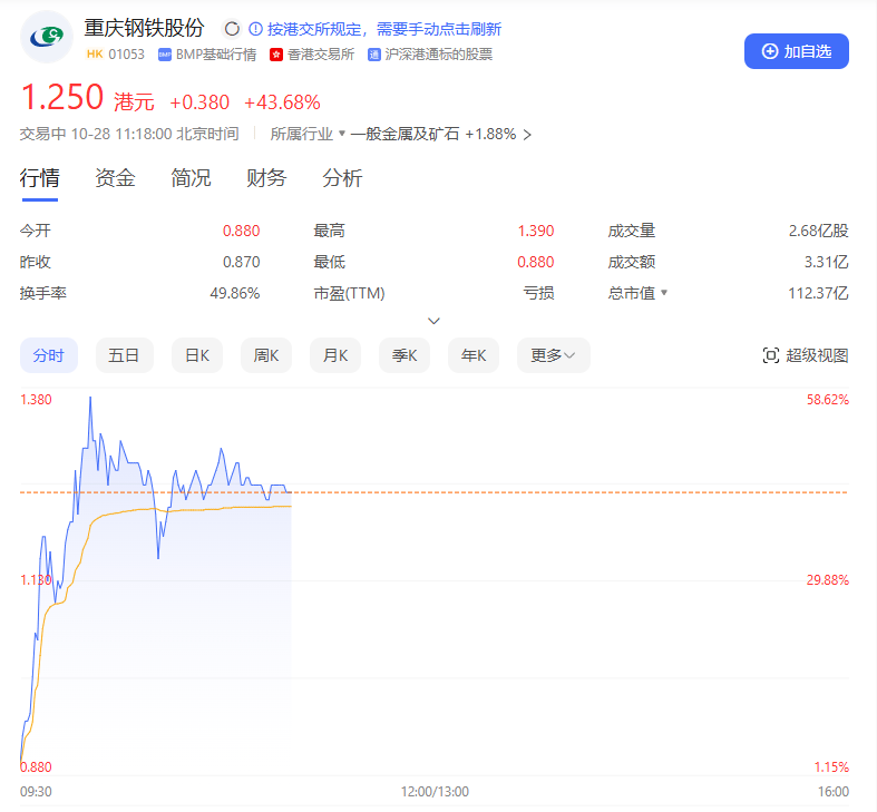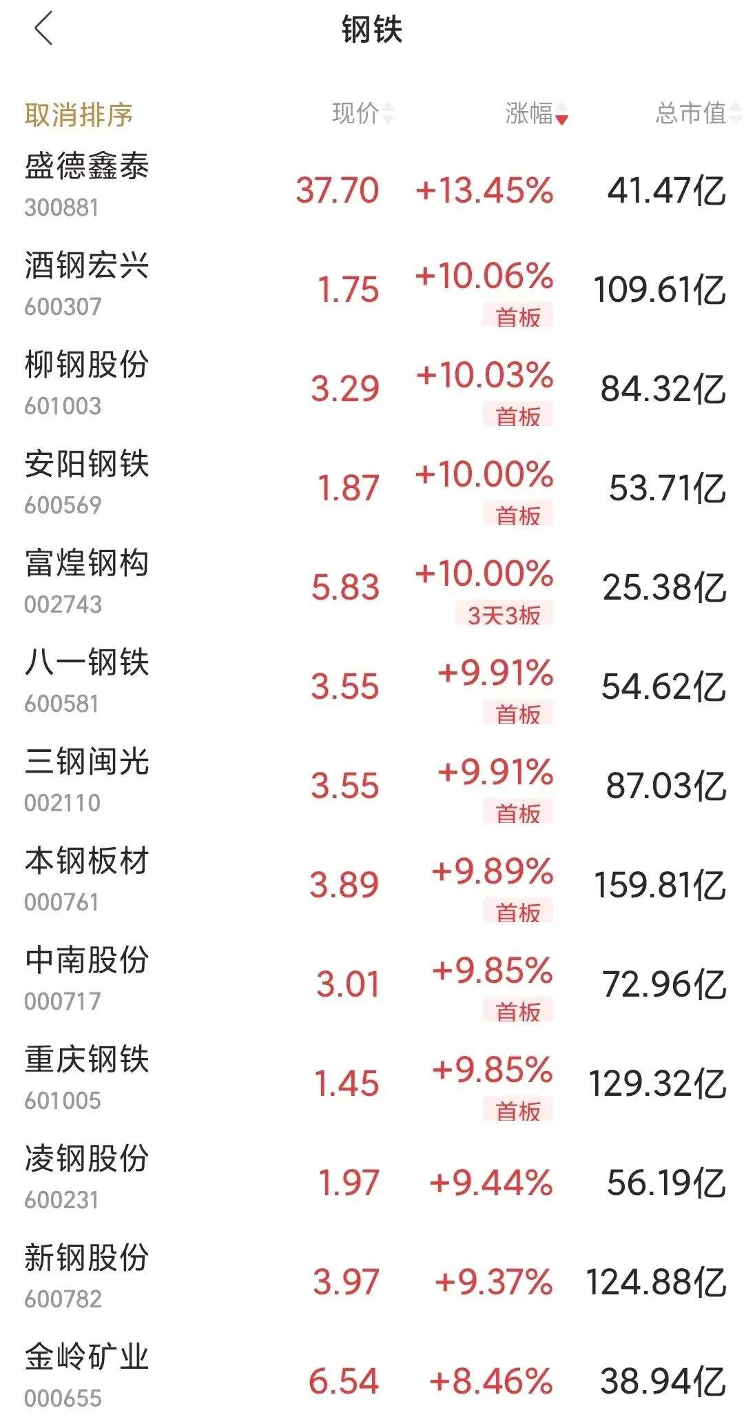 钢铁股普涨。 今天上午A股市场整体低位震荡,主要指数涨跌互现。 行业板块和赛道方面,钢铁板块成为上午盘中最大亮点,板块盘中涨幅一度超过5%,相关个股掀涨停潮。 港股市场整体亦低位震荡。港股大幅波动股中,重庆钢铁(601005)股份大涨,盘中涨幅一度接近60%。 钢铁股掀涨停潮 今天上午A股市场整体低位震荡,主要指数涨跌互现。截至中午收盘,上证指数上涨0.17%,深证成指上涨0.27%,创业板指跌0.47%,两市半日成交额超1.2万亿元。 行业板块和赛道方面,钢铁板块成为上午盘中最大亮点,板块盘中一度上涨超过5%,板块内个股掀起涨停潮,包括柳钢股份(601003)、安阳钢铁(600569)、酒钢宏兴(600307)等在内的多只钢铁股盘中涨停。 消息面,据中国钢铁工业协会官网消息,10月25日,中国钢铁工业协会2024年三季度信息发布会在京召开,钢协党委副书记、副会长兼秘书长姜维在会上呼吁,企业要清醒认识当前形势与以往下行周期相比的特殊性和严峻性,理性面对钢铁行业发展阶段的调整,以实际行动贯彻落实党中央提出的防止“内卷式”恶性竞争要求,认真践行“三定三不要”经营原则,共同自律,努力维护市场稳定、提高经济效益、降低经营风险,真正实现有质量、有效益的发展。 “当前,钢铁企业对行业进入‘减量发展、存量优化’发展阶段已经形成共识,对‘三高三低’运行态势的严峻性已有充分认识,对加强行业自律、防止‘内卷式’恶性竞争的必要性高度认同。”姜维表示,下阶段,钢铁行业将继续推进落实钢协六届八次理事(扩大)会议确定的重点任务,努力实现“稳运行、防风险、提质量、优结构、促转型、增效益”的全年工作目标。 姜维还提出,加快研究推进产能治理和联合重组。联合重组和产能治理是钢铁行业优化运行秩序、改善发展环境的两大基础性举措,二者相互补充完善,引导优胜劣汰,导向供需平衡。当前,联合重组、落后产能退出通道均需要政策支撑。一方面,8月份工信部已暂停公示、公告新的钢铁产能置换项目,堵上新增产能的入口;另一方面,还要尽快建立已有产能退出机制,创造条件引导落后产能退出,促进钢铁产量导向优势产能。同时,坚定不移推进联合重组,坚决防止重组过程中将大量无效产能甚至“僵尸产能”复活。这项工作任务艰巨,需要政府、企业和行业共同推进。钢协已着手加快相关研究、开展专项调研,研究提出促进联合重组和完善退出机制的一揽子相关政策建议。 其他行业板块方面,综合类、公共交通、建材、多元金融、家居用品等板块涨幅也居于市场前列。 华立股份12连板 强势股方面,华立股份(603038)连续12个交易日盘中涨停。 华立股份上周五晚间发布股票交易严重异常波动公告称,公司股票自2024年10月11日至10月25日,已连续11个交易日涨停,日收盘价格涨幅偏离值累计达到185.41%。短期涨幅过大,敬请广大投资者理性投资,审慎决策,注意防范投资风险。 华立股份还称,截至2024年10月25日收盘,公司最新滚动市盈率为370.75,最新市净率为4.67。根据中证指数有限公司发布的数据,公司所属证监会类别为“其他制造业”,公司市盈率指标显著高于同行业平均水平。2024年10月25日,公司换手率为27.26%,存在换手率较高的风险。敬请广大投资者注意二级市场交易风险,理性投资。 华立股份表示,公司目前生产经营活动正常,日常经营情况未发生重大变化。不存在应披露而未披露的重大信息。另外,经公司自查并向控股股东、实际控制人书面征询确认,截至本公告披露日,不存在应当披露而未披露的重大信息。 达刚控股复牌大涨 达刚控股今天上午复牌大涨,盘中涨幅一度超过19%,其后涨幅明显收窄。 达刚控股昨晚发布筹划公司控制权变更事项进展暨公司股票复牌的公告。 公告称,公司于近日收到控股股东孙建西女士通知,获悉如下事宜:2024年10月18日,孙建西与陈可实际控制的上海曼格睿企业管理合伙企业(有限合伙)(以下简称“曼格睿”)签署了《股份转让协议》,孙建西拟将其持有的3493.61万股股份(占上市公司股份总数的11%)转让给曼格睿。同日,孙建西及其一致行动人李太杰与陈可签署了《表决权委托协议》,孙建西和李太杰拟分别将其所持3382.54万股股份和810.69万股股份(合计4193.23万股股份,占上市公司股份总数的13.20%)对应的表决权委托给陈可行使。 2024年10月24日,孙建西和李太杰与陈可签署了《<表决权委托协议>之补充协议》,对表决权委托事宜进一步明确。2024年10月24日,就余下拥有表决权的1588万股上市公司股票,孙建西已经与金祥远舵叁号(深圳)投资合伙企业(有限合伙)(以下简称“金祥远舵”)签订了《股份转让协议》,约定孙建西将其持有的上市公司1588万股股份(占上市公司股份总数的5%)转让给金祥远舵。该股份转让后以及本次权益变动后,孙建西将持有上市公司3382.54万股股份,其中有表决权的数量为0股。 公告表示,前述股份转让交割过户完成及表决权委托协议生效后,陈可及其一致行动人将合计持有、控制公司7686.845万股股份的表决权,占上市公司股份总数的24.20%,公司实际控制人将变更为陈可。 港股市场低位震荡 港股市场整体亦低位震荡。 港股大幅波动股中,重庆钢铁股份大涨,盘中涨幅一度接近60%。截至发稿,该股涨超40%。 东江环保港股亦大涨,盘中涨幅一度超过40%。截至发稿,该股涨超20%。 此外,港股地产股走高,新明中国一