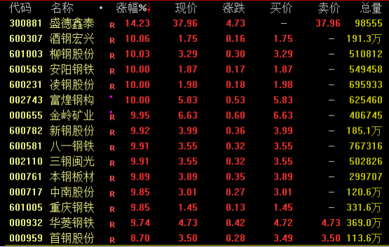 几大指数尾盘均出现拉升,其中沪指、深成指扩大涨幅,上证50指数、北证50指数翻红,创业板指、科创50指数跌幅收窄。 A股今日走势分化,沪指窄幅震荡上扬,尾盘发力拉升;创业板指弱势下探,北证50指数尾盘再度回升;港股盘中探底回升,恒生科技指数涨超1%。 具体来看,沪指盘中围绕3300点窄幅震荡整理,尾盘强势拉升;创业板指盘中大幅下探,一度跌近2%,午后跌幅有所收窄;北证50指数宽幅震荡,盘中一度跌超3%,尾盘再度上扬。截至收盘,沪指涨0.68%报3322.2点,深证成指涨0.62%报10685.89点,创业板指跌0.44%报2229.12点,北证50指数涨0.91%,上证50指数尾盘翻红,沪深北三市合计成交19046亿元,较此前一日增加734亿元。 场内超4200股飘红,钢铁板块爆发,酒钢宏兴(600307)、柳钢股份(601003)、安阳钢铁(600569)、凌钢股份(600231)等逾10股涨停;并购重组概念持续活跃,浩淼科技、东和新材、旭杰科技30%涨停,华立股份(603038)、松发股份(603268)分别斩获12连板和8连板;地产板块走高,华夏幸福(600340)、光大嘉宝(600622)等涨停;农业板块拉升,秋乐种业、荃银高科(300087)等涨停;酒类股亦有表现,皇台酒业涨停,舍得酒业(600702)、山西汾酒(600809)涨近5%。 此外,富时中国A50指数期货午后也强势拉升,一度接近翻红,A股早盘期间该指数期货一度跌超1.4%。 钢铁板块掀涨停潮 钢铁板块今日大幅拉升,截至收盘,盛德鑫泰涨超14%,酒钢宏兴、柳钢股份、安阳钢铁、凌钢股份、新钢股份(600782)、八一钢铁(600581)等逾10股涨停。 港股市场方面,截至收盘,重庆钢铁(601005)股份涨逾31%,盘中一度暴涨近60%;马鞍山钢铁股份涨超9%,鞍钢股份(000898)涨超6%。 消息面上,中国钢铁工业协会(以下简称中钢协)近日表示,将加快研究推进产能治理和联合重组。已着手加快相关研究、开展专项调研,研究提出促进联合重组和完善退出机制的一揽子相关政策建议。 中钢协表示,当前,联合重组、落后产能退出通道均需要政策支撑。一方面,8月份工业和信息化部已暂停公示、公告新的钢铁产能置换项目,堵上新增产能的入口;另一方面,还要尽快建立已有产能退出机制,创造条件引导落后产能退出,促进钢铁产量导向优势产能。同时,坚定不移推进联合重组,坚决防止重组过程中将大量无效产能甚至“僵尸产能”复活。这项工作任务艰巨,需要政府、企业和行业共同推进。已着手加快相关研究、开展专项调研,研究提出促进联合重组和完善退出机制的一揽子相关政策建议。 机构表示,中钢协最近研究提出未来将出台行业供给端整合退出方案。无论“环保”还是“能耗”无非都是解决问题的抓手,目标就是政府配置资源解决市场目前的问题。对于行业后续的调控政策,我们更关心的是未来行业采取何种方式剪除行业的落后产能。随着财政发力加快,需求端逐步向正常水平回归。目前产业库存极低,若配合行业供给端调整政策,三周期会形成共振加快行业回归的进程。目前部分公司处于价值低估区,行业未来存在修复的机会。 地产板块活跃 地产板块盘中发力走高,截至收盘,华夏幸福、光大嘉宝、苏州高新(600736)、市北高新(600604)、浙江东日(600113)、万通发展等涨停。 港股市场,内资地产股亦拉升走高。截至收盘,新明中国涨约133%,盘中一度暴涨超300%;旭辉控股集团涨约16%,佳兆业集团、远洋集团等涨约10%。 行业方面,9月末新政出台三周后,一线城市一二手房成交量明显回升。如深圳宣布放松限购、限售、限价等举措后,新房和二手房市场持续升温,成交量出现明显增长。数据显示,截至10月26日,深圳市10月的新房认购量已达10030套,创近年来新高。此外,北京10月二手房实际成交已突破2万套,为2017年以来同期的最高水平;上海10月二手房成交量也已突破2万套。 国金证券指出,新政后10月楼市呈现复苏行情,后续需要关注楼市热度的持续效果,同时跟进收储、城中村危旧房改造货币化安置等实物工作量的落地情况。若核心城市能够持续释放市场止跌企稳积极的信号,则有望提振信心、改善预期,真正迎来地产止跌企稳的拐点,地产板块有望迎来估值及业绩的修复。 并购重组概念强势 并购重组概念今日再度走强,截至收盘,旭杰科技、浩淼科技、东和新材30%涨停,银之杰(300085)、雅运股份(603790)、松发股份、华东重机(002685)、华西股份(000936)、青岛双星(000599)、华立股份、大唐电信等均涨停。值得注意的是,华立股份已连续12个交易日涨停,松发股份、大唐电信(600198)分别斩获8连板和4连板。 消息面上,近日,北交所分别举办券商、上市公司两场专项座谈会,现场宣讲“并购六条”政策精神,听取券商并购重组项目储备情况、上市公司推进过程中遇到的问题以及对北交所并购重组市场发展的意见建议。中信建投(601066)、华泰联合、中信证券(600030)、开源证券、东吴证券(601555)、申万宏源(000166)证券、中泰证券、国投证券8家券商以及8家北交所上市公司分别参加会议。 北交所相关负责人介绍了市场并购重组基本情况,围绕“并购六条”的政策内容、改革方向以及北交所如何适用等做了详细解读。北交所相关负责人表示,此次发布的“并购六条”旨在激发并购重组市场活力,支持企业通过并购重组更好实现资源有效配置,相关政策一体适用于北交所上市公司。北交所将结合市场特点,积极落实“并购六条”相关举措要求。 浙商证券表示,并购重组推升资产端质量,对于北交