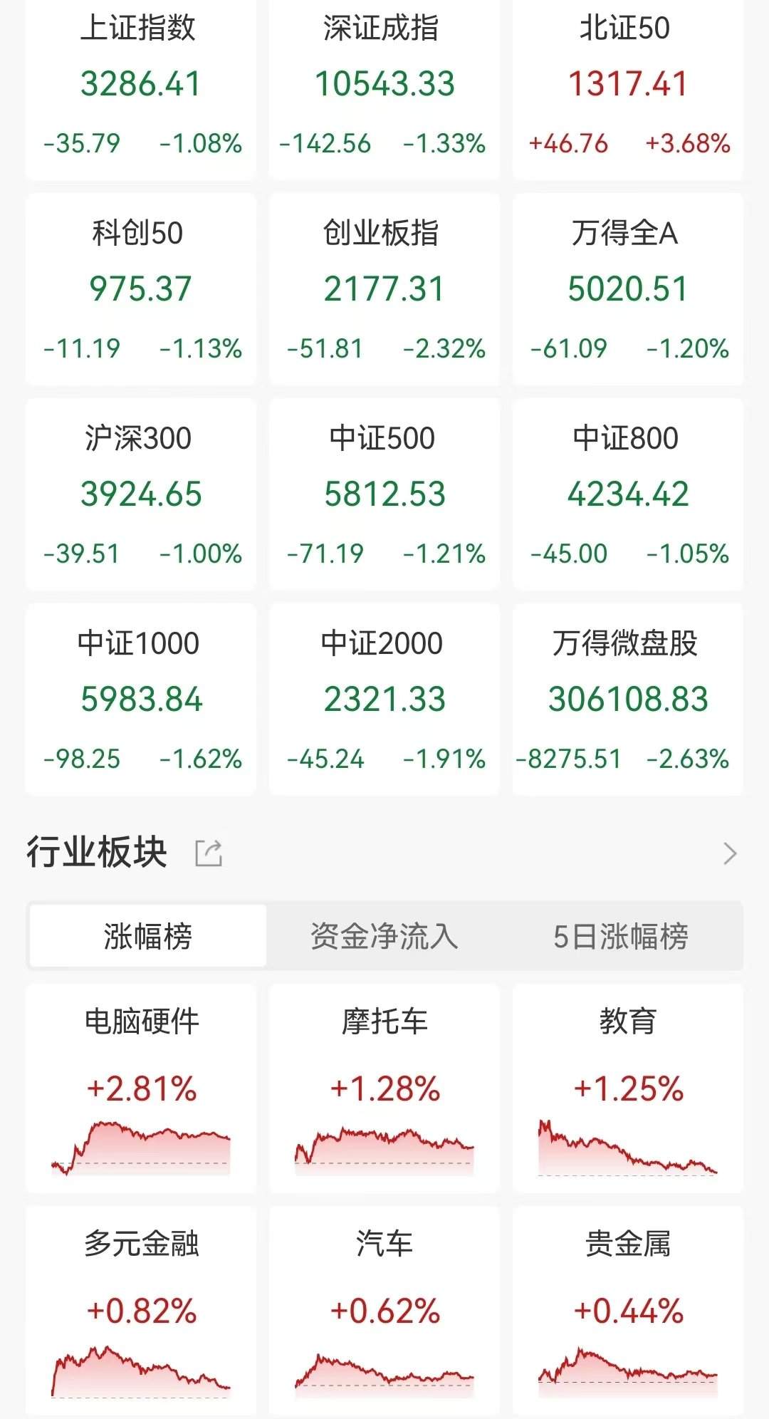格隆汇10月29日|A股主要指数今日高开低走,截至收盘,沪指跌1.08%报3286点,深证成指跌1.33%,创业板指跌2.32%。全天成交2.06万亿元,较前一交易日增量1992亿元,超4200股下跌。 盘面上,智谱AI板块持续活跃,豆神教育两连板;并购重组概念走高,宝塔实业(000595)等多股涨停;转基因板块走强,荃银高科(300087)涨超13%;贵金属、IPv6及全息技术等板块涨幅居前。另外,长寿药板块下挫,雅本化学(300261)跌超10%;CRO板块普跌,皓元医药跌逾10%;煤炭板块走低,云维股份逼近跌停;代糖概念、AI语料及BC电池等板块跌幅居前。(格隆汇) (责任编辑:宋政 HN002)