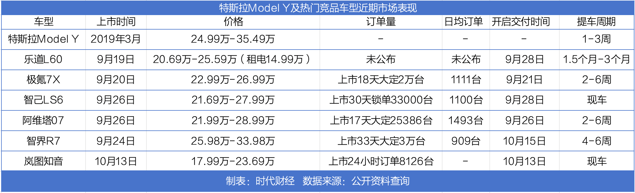 9月至今,多款国产新能源SUV相继亮相市场,这些新车型被蔚来CEO李斌形象地称为“六大门派”。 它们将目标锁定在特斯拉Model Y所在的20万元-30万元价格区间的细分市场,意图抢夺特斯拉在这一价格带的市场份额。 李斌所说的“六大门派”,包括蔚来子品牌乐道推出的首款车型L60。另五款国产纯电SUV是极氪7X、智己LS6、阿维塔07、智界R7和岚图知音。 乐道L60在9月19日上市时,乐道总裁艾铁成宣称:“L60在底层技术上已超越了Model Y”。他此前还表示,“乐道L60完全对标Model Y”。华为车BU董事长余承东在智界R7上市时也喊话,智界R7的目标就是要比Model Y还优秀,并以超越特斯拉Model Y的规格跨级竞争Model X。岚图CEO卢放在发布会对外宣布,岚图知音的各项配置都超过Model Y。 来源:时代财经摄 订单火爆 以Model Y作为标杆,时代财经统计了这批纯电SUV过去一个月的市场表现,从三大维度看看它们到底能否与Model Y一较高下。 首先是订单情况。除Model Y和乐道L60,其它车型都会不定期公布所获订单进展。极氪7X上市10天收获大定超2万辆,日均订单量超1111辆;智己LS6上市30天锁单33000辆,日均收获订单量1100辆;阿维塔07上市17天大定25386辆,日均订单量达1493辆;智界R7上市33天订单达3万辆,日均订单量909辆;岚图知音只公布上市24小时的订单量,达8126辆。 单从订单表现来看,这些国产中型SUV无一不是爆款车型,日均订单量最低也近千辆,最多甚至高达日均近1500辆。不过,真正衡量一款车型是否成为爆款的标准,并非仅是订单量,交付数量才更为重要。 时代财经注意到,9月23日至10月20日,Model Y共交付35350辆新车,日均交付高达1309辆,领先所有同级车型。而它的竞品车型,同期表现就稍显逊色。 自9月28日交付以来,截至10月20日,乐道L60累计交付新车3100辆,日均交付140辆;极氪7X自9月23日到10月20日期间,交付新车8670辆,日均交付321辆;智己LS6自9月28日开启交付到10月20日截止,累计交车4170辆,日均交付189辆;阿维塔07自9月26日交付以来,截至10月20日,累计交付量达3140辆,日均交付130辆;智界R7在10月15日开启交付,截至10月20日,已交付新车2570辆,日均交付量达514辆。 相比较Model Y日均1300余辆的交付表现,同级国产中型纯电SUV显然还难与它比肩。从日均销量来看,目前极氪7X和智界R7已展现出爆款潜质。 提车周期是用户考量的因素之一。位于北京的一家乐道门店销售人员告诉时代财经,现在下定L60要等3个月才能提车,最快的长续航版本也需要1个半月。 对比来看,Model Y提车周期为1-3周,极氪7X需要2-6周,阿维塔07和智界R7分别需要等2-6周和4-6周。只有智己LS6和岚图知音是现车现提。“我家店里智己LS6的5个配置都有现车,现在交钱就能提车。”一家智己线下门店的销售人员说。 来源:时代财经 竞争愈演愈烈 多名销售人员均表达了一个消费现象――新能源用户购车心态像极了此前燃油车用户在BBA豪华品牌与同价位合资品牌之间的选择逻辑,即重视配置和价格的用户,选择国产新能源车型;重视品牌的用户,首选特斯拉Model Y。 “对于重视配置和价格的消费者来说,乐道L60是一个不错的选择;而对于看重品牌力的消费者来说,特斯拉Model Y则更具吸引力。”一名刚从特斯拉转向乐道的销售人员表示,乐道在全国拥有120家门店,10月份每家门店的订单量都超过了100台。 智己的销售人员直言不讳地指出,现在国产新能源车型的做工和配置已不输特斯拉Model Y,价格更加亲民。他所在门店一个月卖了100余台新车,其中多数是新上市的智己LS6。 极氪、岚图的销售人员则冷静看与特斯拉的竞争。 一名极氪的销售人员向时代财经表示,每个品牌都各有优缺点,买特斯拉的用户看重品牌,买乐道是要看蔚来和换电,买智界的用户主要是因为华为和智驾的加持。“买极氪的用户,多数注重实用主义,对安全和配置的丰富程度较为看重。”据他介绍,极氪7X上市以来的大定已超3万台,截至目前已交付1万余台。 来源:时代财经摄 一名岚图的销售人员则表示,选择20万级车型的消费者主要看的还是价格。他所在门店一个月能销售三、四十台新车,其中对标Model Y的岚图知音只占一部分。 阿维塔、智界都将竞品直指Model Y。阿维塔的销售人员向时代财经表示:“阿维塔07比特斯拉Model Y小点儿,但智能化和舒适性更好。9月26到10月26日,一个月交付5000台,大定都爆了。” 智界R7的销售人员更直言,R7比Model Y更豪华,“R7的配置更多,电动遮阳帘、真皮座椅等,这些Model Y都没有。”他声称,智界R7上市一个月,大定订单已超3万辆,“现在想试驾需要提前一天预约。” (责任编辑:郭健东 )
