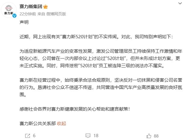 凤凰网科技讯10月29日,赛力斯今晚发布声明称,近期,网上有关“赛力斯520计划”的传闻不实。赛力斯称,为适应新能源汽车产业的变革性发展,激发公司管理层员工持续保持工作激情和年轻化心态,公司曾在一次内部会议 ...