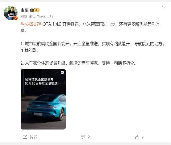 新浪科技讯10月30日中午消息,小米董事长雷军今日在微博上表示,小米SU7OTA1.4.0开启推送,小米智驾再进一步,还有更多新功能等你体验。1.城市领航辅助全国都能开,开启全量推送;实现有路就能开,导航能到的地方, ...