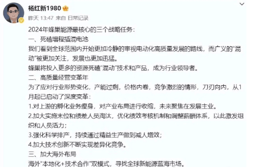文|新浪财经刘丽丽国内第七大动力电池企业蜂巢能源,自从IPO失败后,进入了持续动荡期,且动荡愈演愈烈。该消息发布后,蜂巢能源董事长兼CEO杨红新在其个人微博发文称,公司为了应对行业形势变化,产能过剩,价格内 ...