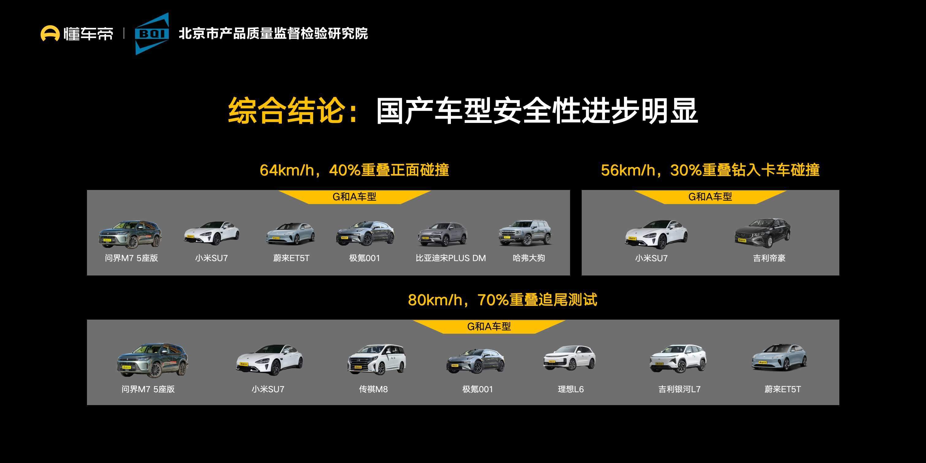 汽车安全正成为消费者越来越关注的话题。为客观呈现汽车产品质量、服务中国消费者安全需求、推动中国汽车产业健康发展,2024年4月-10月,懂车帝选取当前市场主流热销、关注度高的30款新车,由北京市产品质量监督检验研究院(简称北京质检院)作为测试机构,在国家汽车质量检验检测中心(北京顺义)进行了64公里每小时40%重叠正面碰撞、80公里每小时70%重叠追尾碰撞和56公里每小时30%重叠钻入卡车碰撞等3个项目共计90次测试。 测试发现,影响车辆碰撞安全的主要因素是车身用料和安全结构设计,测试结果优异的车型,两者缺一不可。相比合资和海外品牌,中国汽车安全性进步明显。在正面和追尾碰撞中,问界、小米、蔚来、极氪等多个国产品牌车型表现优秀,在车身结构、乘员保护、紧急救援等方面排名靠前。但在卡车钻撞测试中,绝大部分车型安全保障有所欠缺,即使豪华车也不例外。懂车帝与北京质检院呼吁消费者,在驾驶中一定要保持良好的习惯,把控车速和安全距离,守护自己与家人的生命安全。 关注高危事故场景,30款车进行90次碰撞 近年来,碰撞类事故高发、高危,既事关生命安全,也是消费者最关心的汽车内容之一。抖音及懂车帝平台综合数据显示,2024年三季度,“交通事故”主动搜索量同比上升137.8%;“卡车碰撞”相关内容阅读量同比上升148%。与此同时,懂车帝联合中南大学针对交通事故高危场景进行研究发现,在频繁发生的各类高速公路事故中,乘用车追尾卡车致死率是其他车型的4倍。针对交通安全场景开展正向、追尾、钻卡等碰撞测试,对消费者具有重要参考价值。 此次测试选取当前市场主流热销、关注度高的30款新车,参考中、美等多个国家公开测试标准制定规程,最终完成64公里每小时40%重叠正面碰撞、80公里每小时70%重叠追尾碰撞和56公里每小时30%重叠钻入卡车碰撞等三项测试。测试历时6个多月共进行90次碰撞,是目前为止国内单次最大规模的汽车集中碰撞测试。 懂车帝相关负责人介绍,所有碰撞车辆全部为测试组在全国4S店随机自购,均有购买发票记录和提车视频,车辆均为消费者能买到的量产车型,安全性和普通消费者的体验一致。为保证专业性、权威性,测试所有环节由北京质检院专业人员完成,懂车帝负责影像记录和内容发布,全过程可追溯。北京市产品质量监督检验研究院汽车检测研究所副总工程师方哲在测试中表示,测试的初衷是关心如何在各类事故中,尽可能挽救乘员生命安全。通过一致性测试,推动行业内推出更多安全性优秀的产品。 此外,本次测试所用假人是世界上广泛使用的Hybrid Ⅲ 50th男性假人及Hybrid Ⅲ 5th女性假人,具备良好的数据采集系统,能够在各类模拟事故中更加真实地反映出乘员受伤情况,并获得全球各国检验检测机构认可。根据公安部公布的数据,2021年我国女性驾驶员数量1.62亿,占比达到33.68%。测试部分项目驾驶员选择女性假人,也更好地反映了女性驾驶员在高速碰撞事故中遇到的安全问题,使测试结果更有实用参考意义。 中国品牌安全性进步明显,并非价格越高车辆越安全 此次测试从消费者立场和汽车安全视角出发,围绕交通事故中“车损”和“人伤” ,开展车身结构、营救安全、乘员损伤三项指数的测试和评价,最终评价结果借鉴C-NCAP(中国新车评价规程)、C-IASI(中国保险汽车安全指数)等国内主流评价方式,以直观的等级:优秀(G)、可接受(A)、一般(M)和差(P)的形式对外发布,为汽车安全研发、消费者购车用车提供数据参考。 从测试结果来看,中国品牌安全性进步明显,新能源车动力电池全部未出现起火现象。在80公里每小时70%重叠追尾测试中,问界M7 5座版、小米SU7、传祺M8、极氪001、理想L6、吉利银河L7、蔚来ET5T取得G/A级评价;在64公里每小时40%重叠正面碰撞中,问界M7 5座版、小米SU7、蔚来ET5T、极氪001、比亚迪(002594)宋PLUS DM、哈弗大狗取得G/A级评价;在56公里每小时30%重叠钻入卡车碰撞中,小米SU7、吉利帝豪取得G/A级评价。 分价格来看,并非价格越高车辆越安全。测试车型中30-50万价位车型取得G和A级评价占比最高,甚至优于50万以上豪华车型,但10万元以下车型总体结果一般。 测试结果显示,虽然不少车型在正面和追尾碰撞中很多车型表现较好,但卡车钻撞多数车型表现不佳。由于卡车钻入碰撞角度特殊,发生碰撞时副驾侧A柱的弯折幅度急剧增大,甚至带来B柱、C柱的严重损害,最终极大影响驾乘人员生命安全。尽管是一次探索性的测试,但针对卡车钻撞场景,车企可以进行产品提升,使消费者得到更多安全保障。 除车辆本身安全性能外,司机驾驶行为对交通安全有重大影响。测试人员提醒,车速和车距对于车辆碰撞结果具有重要影响,用户在驾驶中一定要保持良好的习惯,在系好安全带的同时,尤其和大卡车保持安全距离。 懂车帝相关负责人表示,测试可以重来,生命只有一次。懂车帝希望和测试机构、广大车企和用户一起,倡导用户安全和文明驾驶,做好生命安全的第一把关人;也希望通过测试见证中国汽车质量越来越好,记录中国汽车工业进步,和行业一起守护用户安全,为中国汽车走向世界贡献自己的力量。方哲则提到,对于有志于出海的中国车企,测试结果也能为产品海外推广提供参照。 (责任编辑:徐帅 )