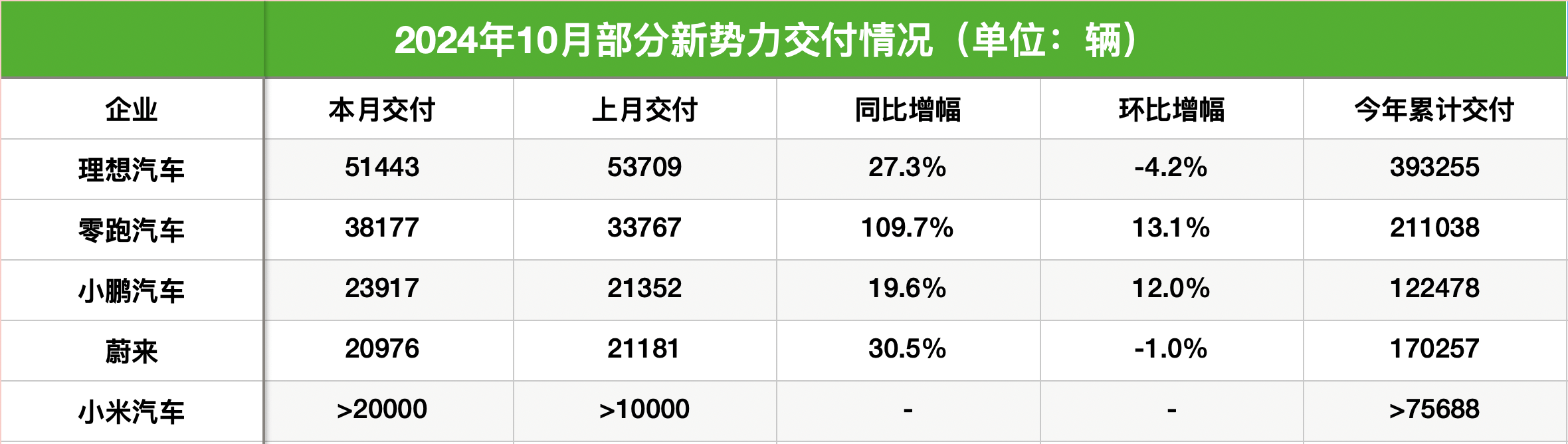 11月1日,多家新能源车企公布了10月的交付数据。造车新势力方面,理想汽车依旧位列当月新车交付榜第一位。理想汽车公布的最新交付数据显示,2024年10月,理想汽车交付新车约5.14万辆,同比增长27.3% ...