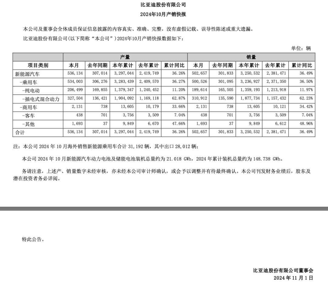 11月1日,多家车企公布了10月的交付数据。从已公布的数据来看,多家企业实现了销量或交付量的同比增长。其中,比亚迪(002594)10月单月销量突破50万辆。这意味着比亚迪成为第一家月销超50万辆的中国车企。 具体来看,11月1日晚间,比亚迪公告,公司10月乘用车销量500,526辆,上年同期为301,095辆。今年1-10月,比亚迪乘用车累计销量323.7万辆,比上年同期增长36.5%。比亚迪10月新能源车销量502657辆,其中乘用车纯电动189614辆,插电式混合动力310912辆。 而就在9月,比亚迪单月新能源车销量刚突破40万辆,达到419426辆,成为全球首个单月汽车销量突破40万辆的新能源车企。 10月30日晚,比亚迪发布了2024年三季度业绩,前三季度公司实现营业收入5022.5亿元,同比增长18.9%,实现净利润252.4亿元,同比增长18.1%。第三季度单季,比亚迪已经在营收上反超了特斯拉。2024年第三季度,比亚迪实现营收2011.25亿元,而特斯拉三季度营收换算后接近1800亿元。 对于这份业绩报告,10月31日,花旗银行发布研究报告,指出比亚迪第三季度业绩强劲,电动车销量超出市场预期。 花旗银行的报告强调,比亚迪第三季度每辆汽车的净利润达到9300元,较第二季度的8500元有所提升,整车平均毛利率提高至25.6%。此外,比亚迪第三季度的自由现金流与净利润转换率达到171%,经营性自由现金流按季和按年分别增长了996%和165%,均超出预期。花旗继续将比亚迪列为行业龙头,并维持“买入”评级,同时预计比亚迪明年首季的销量及盈利能见度将高于同业,因此将其目标价从488港元上调至500港元。 造车新势力方面,理想汽车依旧位列当月新车交付榜第一位。理想汽车公布的最新交付数据显示,2024年10月,理想汽车交付新车约5.14万辆,同比增长27.3%。截至2024年10月31日,理想汽车在2024年共交付39.32万辆新车,历史累计交付量为102.67万辆。 制表:每经记者 孙磊 “理想汽车凭借五款在售车型,连续7个月获得20万元以上新能源汽车中国品牌销量冠军。同时,理想汽车在10月成为首家均价在30万元以上、累计销量超过百万辆的中国豪华汽车品牌。”理想汽车董事长兼CEO李想表示。 紧随其后的是零跑汽车。11月1日,零跑汽车公布的最新交付数据显示,2024年10月,零跑汽车交付量达3.81万辆,连续5个月创月交付量历史新高,同比增长超109%。 值得注意的是,在10月31日晚间,零跑汽车创始人、董事长、CEO朱江明在社交媒体上透露称:“10月份,(零跑)再次刷新订单纪录,C10、C11、C16三款车型订单全部过万(辆)。10月,零跑锁单量已突破4.2万辆。” 11月1日,小鹏汽车公布最新交付成绩。10月,小鹏汽车共交付新车近2.4万辆,同比增长20%,环比增长12%,创单月交付历史新高。其中,小鹏MONA M03上市两个月交付连续破万辆;2024年1~10月,小鹏汽车累计交付新车约12.25万辆,同比增长21%。 小鹏汽车方面表示,11月7日,其将举办“小鹏P7+上市发布会”,小鹏P7+将上市并开启交付,以寻求交付量方面的再度增长。 蔚来汽车10月销量约2.1万辆,同比增长30.5%,连续6个月交付量超2万辆。截至2024年10月31日,蔚来今年已交付约17.03万辆汽车,同比增长35.1%。 具体来看,蔚来品牌10月交付新车1.67万辆;今年1~10月,蔚来品牌共交付新车16.5万辆,同比增长30.97%。乐道L60上市首个完整交付月,共交付新车4319辆。截至目前,乐道品牌已累计交付新车5151辆。 据小米汽车官博11月1日消息,10月,小米SU7交付量超过2万辆,单月交付量首次突破2万辆,预计本月将提前完成10万辆全年交付目标。 传统车企参与打造的新品牌方面,广汽埃安10月全球销量超4万辆。广汽埃安方面表示,AION RT预售订单突破2.8万辆,将在11月6日上市并开启交付。同时,埃安、吴铂双品牌全新品类车型将于今年广州车展全球首发。 2024年10月,鸿蒙智行全系交付新车约4.16万辆。其中,问界M9 10月交付1.6万辆,发布10个月累计大定突破16万辆;问界M7系列10月交付1.58万辆;智界R7 10月交付4730辆。 极氪宣布,其10月交付超2.5万辆新车,同比增长92%,环比增长17%;1~10月共交付约16.8万辆新车,同比增长82%。同时,极氪公布11月限时购车权益,旗下全系车型推出全年第一次跨车型联合行动,至高可省11万元。 11月1日,岚图汽车公布10月交付数据显示,10月,岚图汽车交付新车约1.02万辆,连续两个月销量破万辆;今年1~10月,岚图汽车累计交付6.27万辆新车,同比增长87%,月销实现“六连涨”。 深蓝汽车10月交付约2.79万辆新车,全系订单超3.62万辆,新车S05上市10天订单超1万辆,并开启大规模交付;阿维塔科技宣布,10月公司销量超1万辆,同比增长150%,环比增长120%;智己汽车同样在10月实现销量超1万辆,同比增长149%;极越则宣布,其10月交付量首次突破3000辆,为3107辆,环比增长19%。 从上述车企公布的销量或交付数据来看,多个品牌都呈现同比增长态势。中国汽车流通协会乘用车市场信息联席分会(以下简称乘联分会)此前发文表示,预计10月份国内狭义乘用车零售销量约220万辆,同比增长8.2%,环比增长4.3%;新能源车零售销量预计可达到115万辆,环比增长2.4%,渗透率达到52.3%。 中国汽车流通协会方面表示,国内车市销量的增长,得益于汽车以旧换新政策与地方置换补贴的双重激励,国庆黄金周全国各地大规模车展的举办,以及经销商冲刺年终目标积极开展促销活动、新车型密集投放等多种因素的助推。 乘联分会方面进一步披露称,燃油车和新能源在“十一”期间客流及订单均持续走高,但两者热度在节