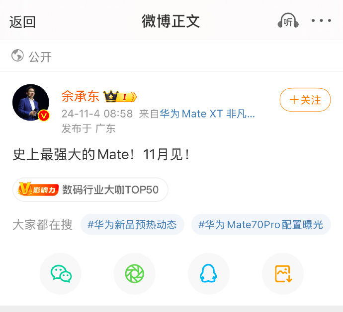 凤凰网科技讯11月4日,今日,华为常务董事、终端BG董事长、智能汽车解决方案BU董事长余承东微博发文,宣布史上最强大的Mate11月见,这预示着Mate70系列新机即将发布。今年4月华为分析师大会上,华为副董事长、轮值董 ...