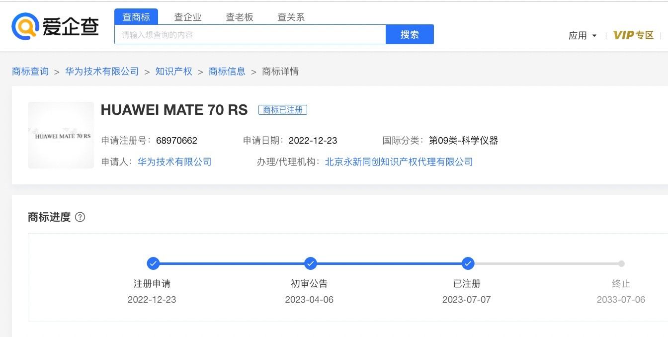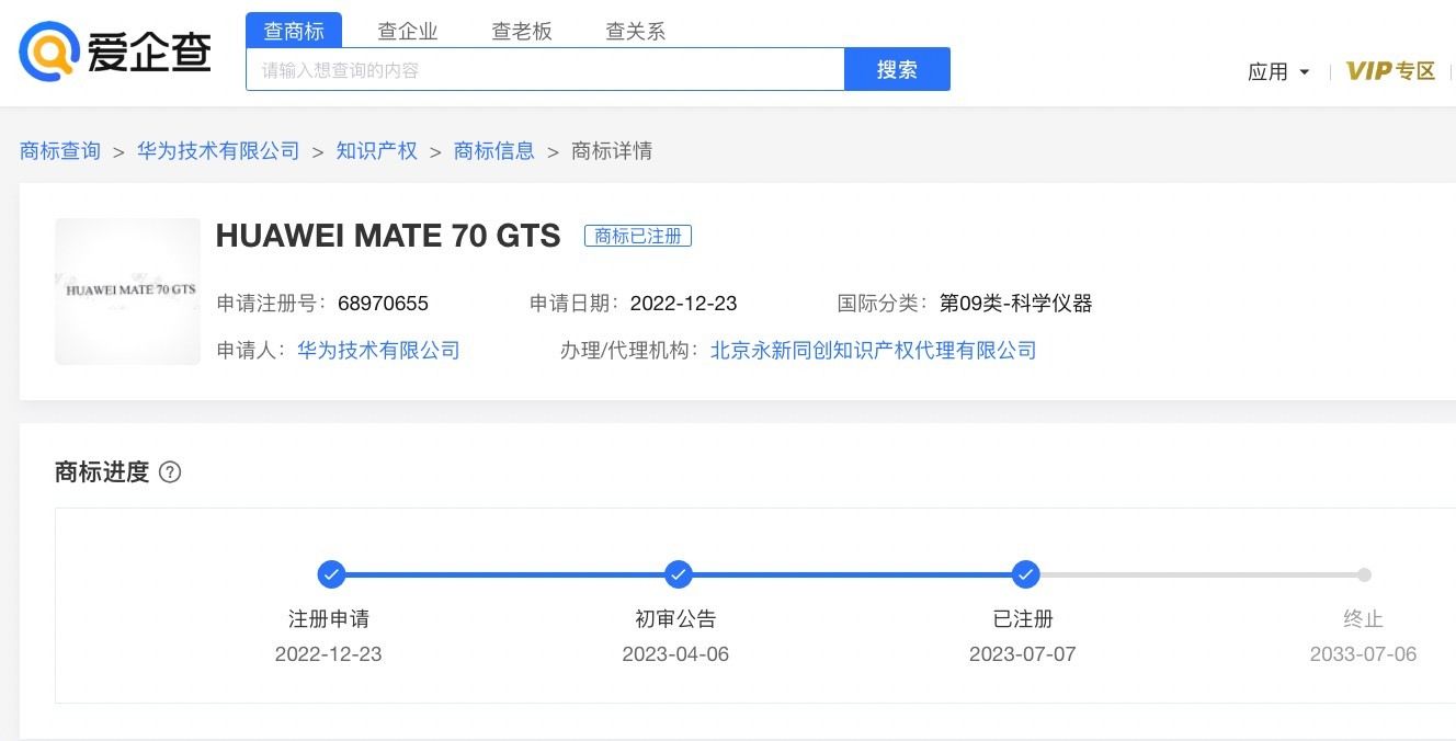凤凰网科技讯 11月4日,华为已成功注册MATE 70相关商标,华为常务董事、终端BG董事长、智能汽车解决方案BU董事长余承东11月4日在社交媒体宣布,华为Mate70系列将于11月正式亮相,这或许将是史上最强大的Mate。爱企查App显示,华为技术有限公司曾于2022年12月申请注册“HUAWEI MATE 70 GTS”“HUAWEI MATE 70 RS”商标各一枚,国际分类均为科学仪器,上述商标均于2023年7月成功注册。 值得一提的是,华为技术有限公司还于同时期申请注册了“HUAWEI MATE 80 GTS”“HUAWEI MATE 80 RS”“HUAWEI MATE 90 GTS”“HUAWEI MATE 90 RS”“HUAWEI MATE 100 GTS”“HUAWEI MATE 100 RS”商标,国际分类均为科学仪器,上述商标均于2023年7月成功注册。 图源 爱企查 (责任编辑:刘静 HZ010)