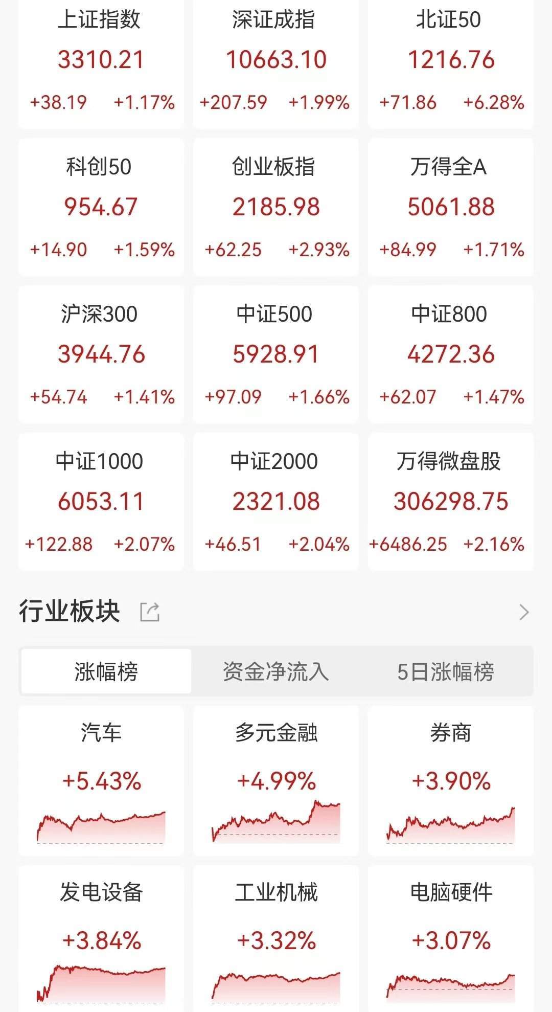 人大常委会将公布10万亿救市措施,A股主要指数收盘纷纷上涨,全天成交1.69万亿元,机器人概念、减速器板块表现强劲,汽车整车板块也普涨,房地产板块走低,特发服务跌停,教育板块走弱,转基因、稀土永磁及水泥建材 ...