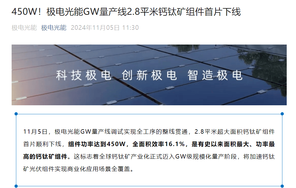 每经AI快讯,11月5日,据极电光能微信公众号消息,极电光能GW量产线调试实现全工序的整线贯通,2.8平米超大面积钙钛矿组件首片下线,组件功率达到450W,全面积效率16.1%,这是有史以来面积最大、功率最高的钙钛矿组 ...
