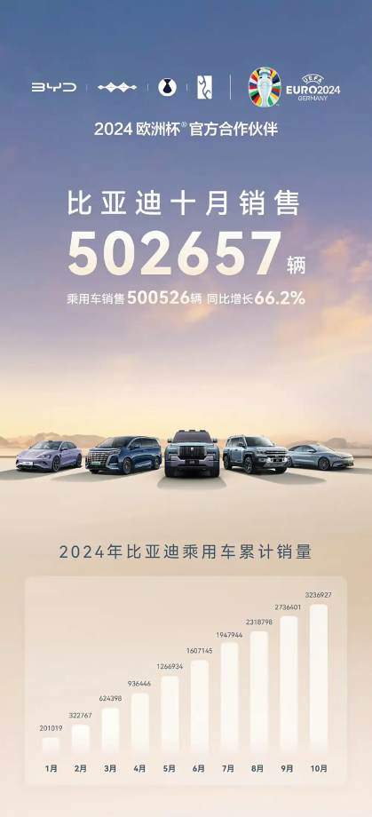50.3万辆,这是比亚迪最新公布的10月销量数据。特斯拉单月销量最高记录是21.1万辆,而比亚迪10月销量是其巅峰单月销量的两倍还多;国内南北大众加起来,历史最 ...