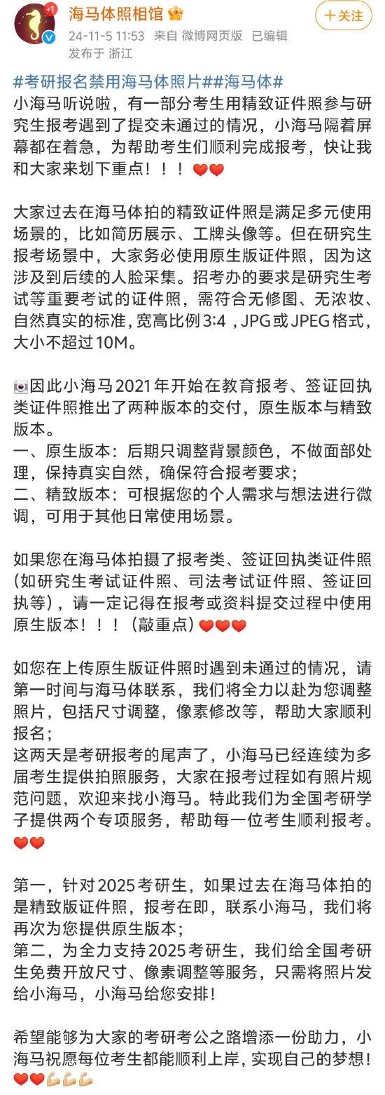 同辰科技讯 11月5日上午消息,据媒体报道,近日有网友发文称2025年考研网上报名系统中,辽宁抚顺报考点禁止使用海马体照片作为准考证照片。 对此,海马体官方微博作出回应,全文如下: 大家过去在海马体拍的精致证件照是满足多元使用场景的,比如简历展示、工牌头像等。但在研究生报考场景中,大家务必使用原生版证件照,因为这涉及到后续的人脸采集。招考办的要求是研究生考试等重要考试的证件照,需符合无修图、无浓妆、自然真实的标准,宽高比例3:4 ,JPG或JPEG格式,大小不超过10M。 因此小海马2021年开始在教育报考、签证回执类证件照推出了两种版本的交付,原生版本与精致版本。 一、原生版本:后期只调整背景颜色,不做面部处理,保持真实自然,确保符合报考要求; 二、精致版本:可根据您的个人需求与想法进行微调,可用于其他日常使用场景。 如果您在海马体拍摄了报考类、签证回执类证件照(如研究生考试证件照、司法考试证件照、签证回执等),请一定记得在报考或资料提交过程中使用原生版本!!! 如您在上传原生版证件照时遇到未通过的情况,请第一时间与海马体联系,我们将全力以赴为您调整照片,包括尺寸调整,像素修改等,帮助大家顺利报名; 这两天是考研报考的尾声了,小海马已经连续为多届考生提供拍照服务,大家在报考过程如有照片规范问题,欢迎来找小海马。特此我们为全国考研学子提供两个专项服务,帮助每一位考生顺利报考。 第一,针对2025考研生,如果过去在海马体拍的是精致版证件照,报考在即,联系小海马,我们将再次为您提供原生版本; 第二,为全力支持2025考研生,我们给全国考研生免费开放尺寸、像素调整等服务,只需将照片发给小海马,小海马给您安排。(罗宁) 责任编辑:郝欣煜 (责任编辑:张晓波 )