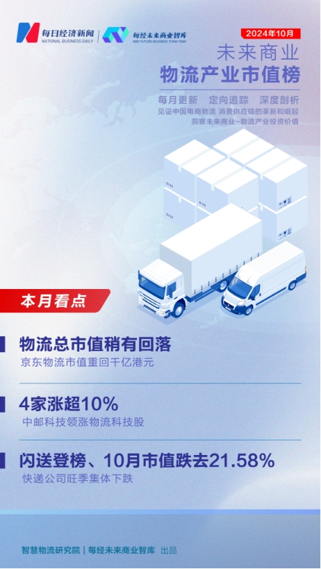 每经记者 王郁彪 每经编辑 董兴生 作为长期深耕上市公司领域、关注新经济发展的财经专业媒体,每日经济新闻旗下智慧物流研究院、每经未来商业智库自2021年5月起,每月定期推出“未来商业-物流产业市值榜”。未来拓展范围将主要聚焦“电商物流”“消费供应链”和“物流科技”涉及的各环节相关上市公司。(专题|未来商业-物流产业市值榜) 闪送(FLX)于10月4日在纳斯达克挂牌上市,我们的榜单再添一家新的物流公司,即时配送维度也得到进一步增强。与9月份30家公司市值强势大涨相比,10月,31家物流公司中,仅13家市值上浮,4家市值涨超10%,物流产业总市值因此稍有回落,为7558.56亿元。 其中,京东物流(HK02618)延续9月涨势,或是受益于全面接入淘宝天猫这一“互联互通”的消息影响,成为三家头部中唯一市值上涨的公司,港股市值也重回千亿港元。10月,快递公司提前迎来“双11”大促旺季,今年,京东、淘宝天猫均在10月14日晚8点开启“双11”,比去年提早了10天;而抖音在10月8日就启动“双11”大促。但物流公司市值表现却“旺季不旺”,通达系和极兔速递(HK01519)市值均有不同程度下跌。 在第43期报告中,我们通过对31家物流及其相关产业上市公司2024年10月市值数据持续追踪,从产业格局、总市值排名、市值涨跌幅、物流科技子榜等维度,进行物流产业市值分析。