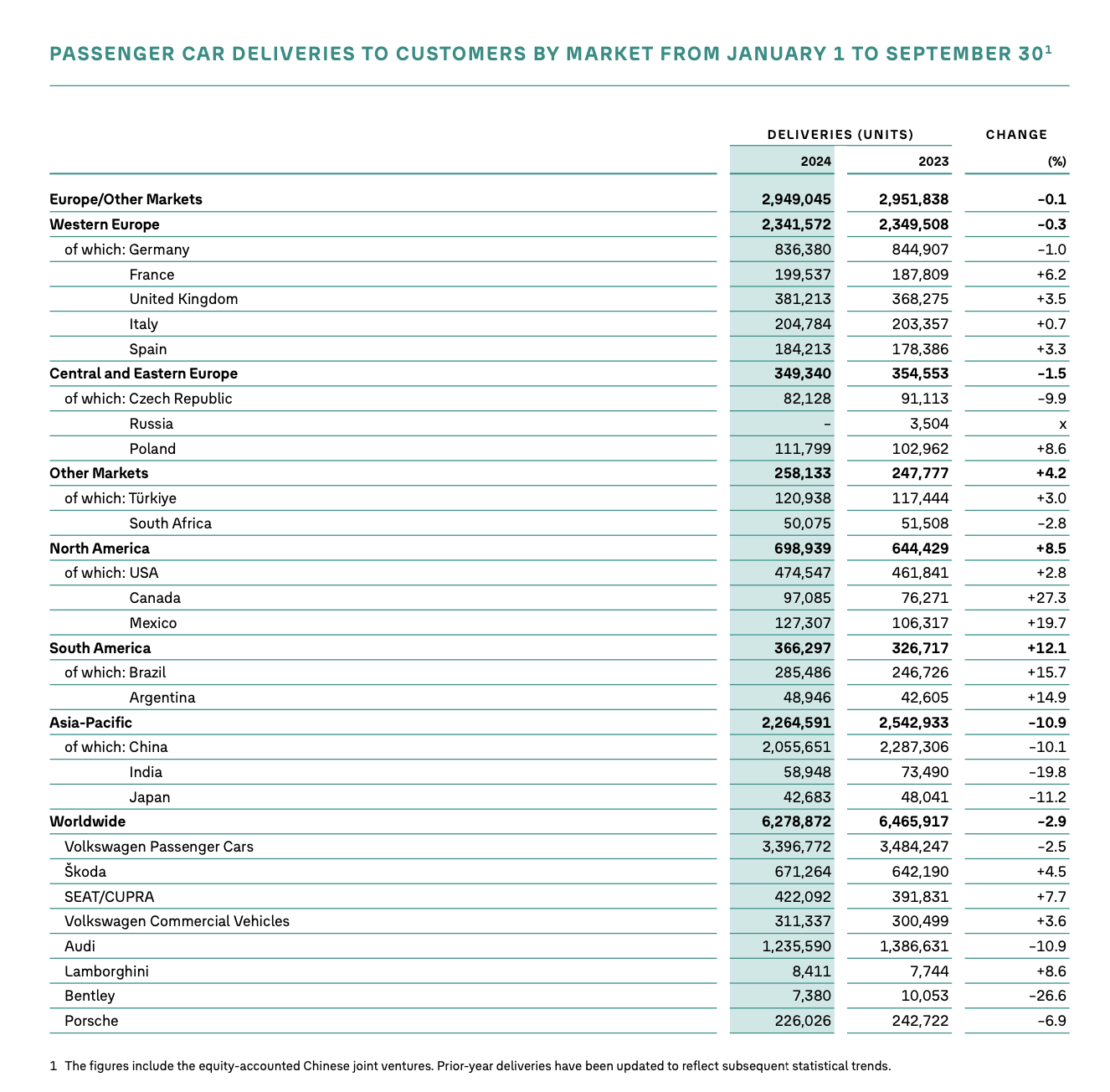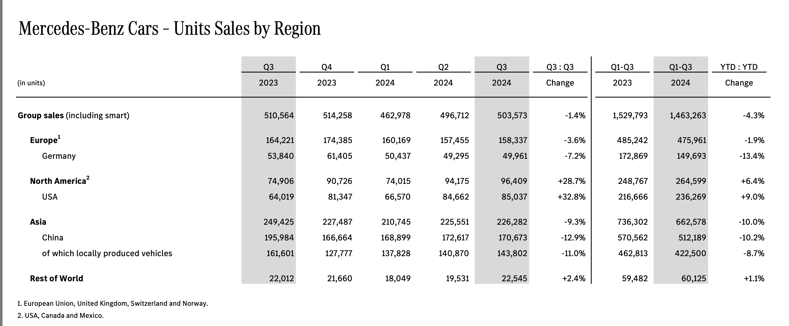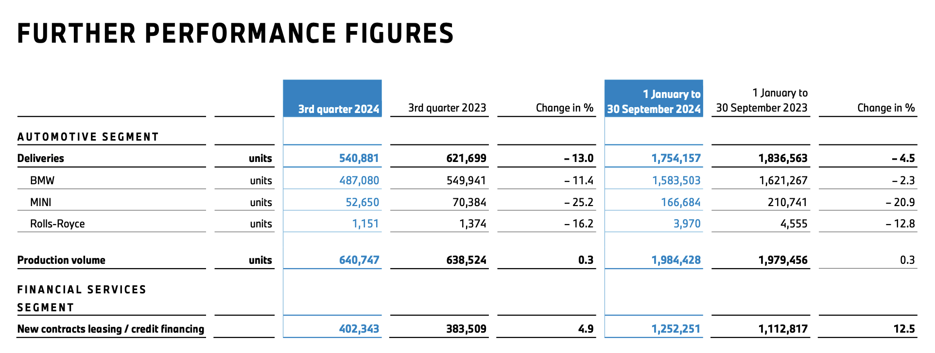 11月6日,宝马集团发布了2024年三季度业绩。期内其营收约为324.06亿欧元,同比减少15.7%;息税前利润约为16.96亿欧元,净利润约为4.76亿欧元。今年前三季度,宝马集团累计实现营收1059.64亿欧元,同比减少5.8%;息税前利润和净利润分别为96.27亿及61.32亿欧元,同比分别减少31.6%及35.8%。 至此,奔驰、宝马、大众三家德系汽车巨头已悉数公布三季度业绩。 根据梅赛德斯-奔驰集团于10月25日发布的财报,三季度该集团营收约为345.28亿欧元,同比减少6.7%;息税前利润和净利润分别约为25.17亿欧元及17.19亿欧元。前三季度,梅赛德斯-奔驰集团累计营收1071.44亿欧元,同比下降5%;息税前利润104.17亿欧元,同比下降4.7%;净利润78.06亿欧元,同比减少31.4%。 另据大众汽车集团10月30日发布的三季度业绩,期内其营收同比微降0.5%至784.78亿欧元,净利润约为15.76亿欧元。前三季度其累计实现营收2372.79亿欧元,同比提升0.9%;实现净利润89.17亿欧元,同比下降30.7%。 图源:图虫创意 按照财报公布的数据,三家企业前三季度净利润合计相较2023年同期减少109.35亿欧元。 不管是从业绩表现还是近期的企业动向来看,在新能源汽车快速发展的大势之下,三家企业都面临着严峻的市场挑战,调整成为当前的主旋律。 在中国市场遇困境 值得注意的是,三季度三家企业的利润降幅均高于营收降幅。除了受到期内突发事件的影响外,中国市场激烈竞争带来的影响依旧不容忽视。除“蔚小理”等新势力外,比亚迪、吉利、长安等自主品牌也在新能源汽车领域向高端市场发起冲击,小米汽车等新玩家也蓄势待发。 三季度,宝马集团交付新车54.09万辆,同比减少13.0%。因市场竞争加剧以及集成制动系统(IBS)问题导致的交付中断,期内其在中国市场交付量下滑29.8%至14.77万辆。今年前三季度,宝马集团累计交付新车175.42万辆,同比减少4.5%。受前述因素影响,宝马集团三季度盈利水平出现较为明显的下滑。 2024Q3宝马集团销量(图源:财报截图) 梅赛德斯-奔驰集团三季度汽车销量(不含货车)为50.36万辆,同比微降1.4%,GLC销量明显提升,GLE销量出现下滑。中国市场销售17.07万辆。前三季度,该集团累计销售新车146.33万辆,同比减少4.3%;中国市场销售新车51.22万辆,同比减少10.2%。 2024Q3梅赛德斯-奔驰集团销量(图源:财报截图) 梅赛德斯-奔驰集团也在财报中表示,产品结构调整、产品相关成本增加、纯电车型优惠政策影响、中国经销商促销力度加大都是导致三季度息税前利润同比下滑的主要原因。 大众汽车集团也将业绩下滑归因于内部重组计划(品牌结构重组、关闭部分工厂等)的开展和中国市场的疲软表现。前三季度,该集团累计交付乘用车627.89万辆(不含商用车),同比下降2.9%;其中,中国市场交付乘用车205.57万辆,同比下降10.1%。 按品牌划分,大众乘用车、奥迪、宾利、保时捷品牌前三季度全球交付量均有不同程度的同比下滑,斯柯达、兰博基尼品牌实现了交付量同比提升。其中,奥迪品牌前三季度交付123.56万辆,同比下降10.9%。 2024前三季度大众汽车集团乘用车交付量(图源:财报截图) 乘联分会数据显示,2024年7月-9月,中国新能源汽车零售渗透率连续3个月突破50%。近期新能源领军企业的市场优势持续扩大,各类补贴政策利好叠加下,新能源渗透率持续提升。然而对于仍以燃油车为主销车型的德系三巨头而言,这种变化带来的挑战远比机遇更多。 广撒网,多捞鱼 然而被迫加入价格战的合资品牌逐渐发现,“以价换量”策略并未取得预期效果,反而对品牌价值和经销商经营情况产生了负面影响。部分经销商率先倒下,为这些拥有数十年历史的品牌敲响警钟。为降低经销商压力、维持价格体系,今年7月初,宝马率先收回部分优惠政策,旗下多款车型终端售价反弹3万-5万元。随后奔驰、奥迪等多个合资品牌跟进。 相较于直接降价,多产品线布局、升级现有产品智能化配置为合资品牌提供了新的突围思路。 宝马集团预计,随着新款BMW i4、BMW X3、MINI Cooper五门版等新车型的上市以及IBS问题得到解决,四季度交付量将出现回升。 管理层还在业绩会上表示,宝马集团致力于在各个细分市场布局新能源产品。针对中国市场的价格竞争,集团将通过本地化生产的方式降本。此外,宝马集团在纯电、插混、氢能方面均有布局,并已进行了大量的投资;集团将于2028年推出一款氢能产品,并推动氢能成为集团一大业务支柱。 基于前三季度的市场表现,梅赛德斯-奔驰集团指出,2024年汽车销量、营收预期将略低于2023年水平,电动化车型销售占比预期约为18%-19%,较年初预期有所下调。根据财报公布的数据,前三季度梅赛德斯-奔驰集团电动化车型(纯电+插混)销量同比减少7.8%至26.74万辆,约占期内总销量的18.3%,纯电、混动车型销量各半,但后者销量出现了13.9%的同比提升。 广州车展期间,纯电G级越野车、新款纯电EQE以及2025款GLC将迎来上市,新车在智能化配置上有明显升级;特别是2025款GLC,配备高通骁龙8295车机芯片,将支持L2+级别的智能驾驶功能。根据梅赛德斯-奔驰集团方面制定的目标,预计到本十年(2020-2030年)后半段实现电动化车型销售占比50%。 尽管前三季度整体交付量出现下滑,但大众汽车集团在中国的新能源汽车交付量出现明显提升。三季度该集团在华累计交付纯电车型5.75万辆,同比增长5.2%;今年前三季度在华累计交付纯电车型14.81万辆,同比增长26.5%。 为更快推动在华电动